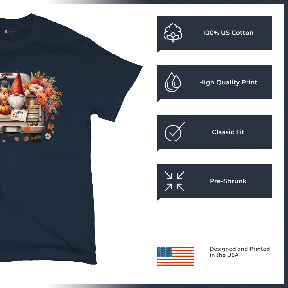 Bring fall charm into your wardrobe with this rustic gnome truck design. Overflowing with pumpkins, wildflowers, and a glowing lantern, it’s perfect for Thanksgiving, farmhouse gatherings, harvest festivals, and celebrating the floral autumn season in cozy style.