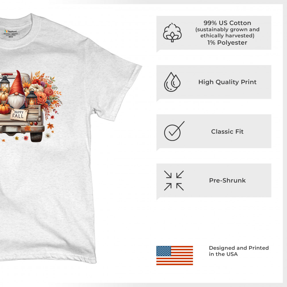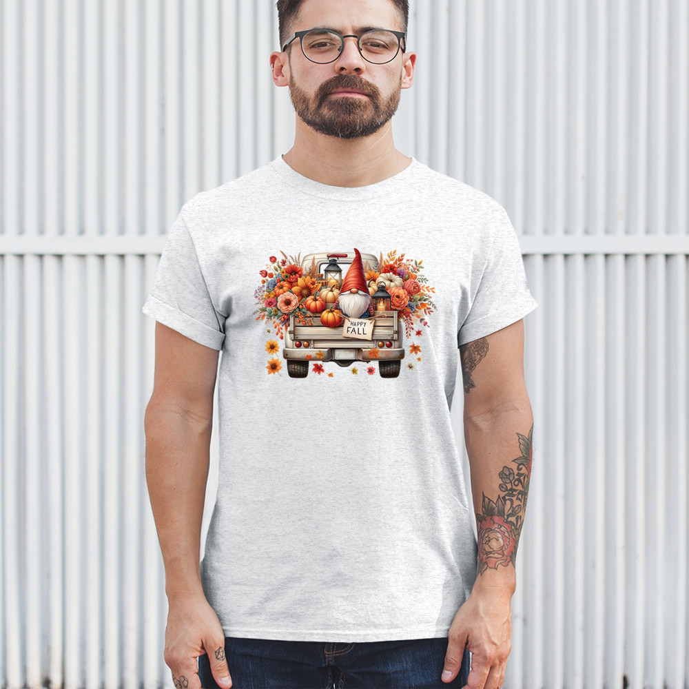 Bring fall charm into your wardrobe with this rustic gnome truck design. Overflowing with pumpkins, wildflowers, and a glowing lantern, it’s perfect for Thanksgiving, farmhouse gatherings, harvest festivals, and celebrating the floral autumn season in cozy style.