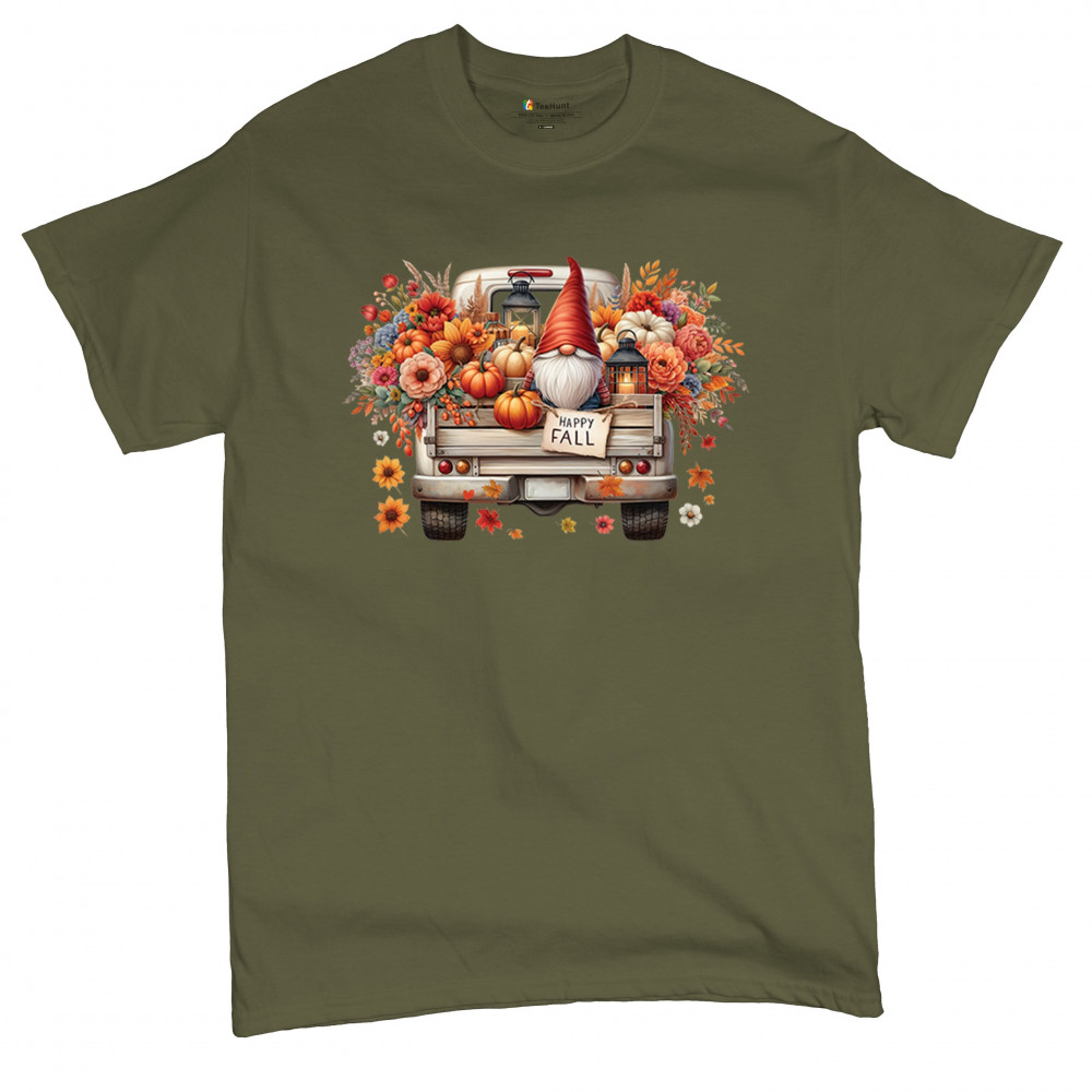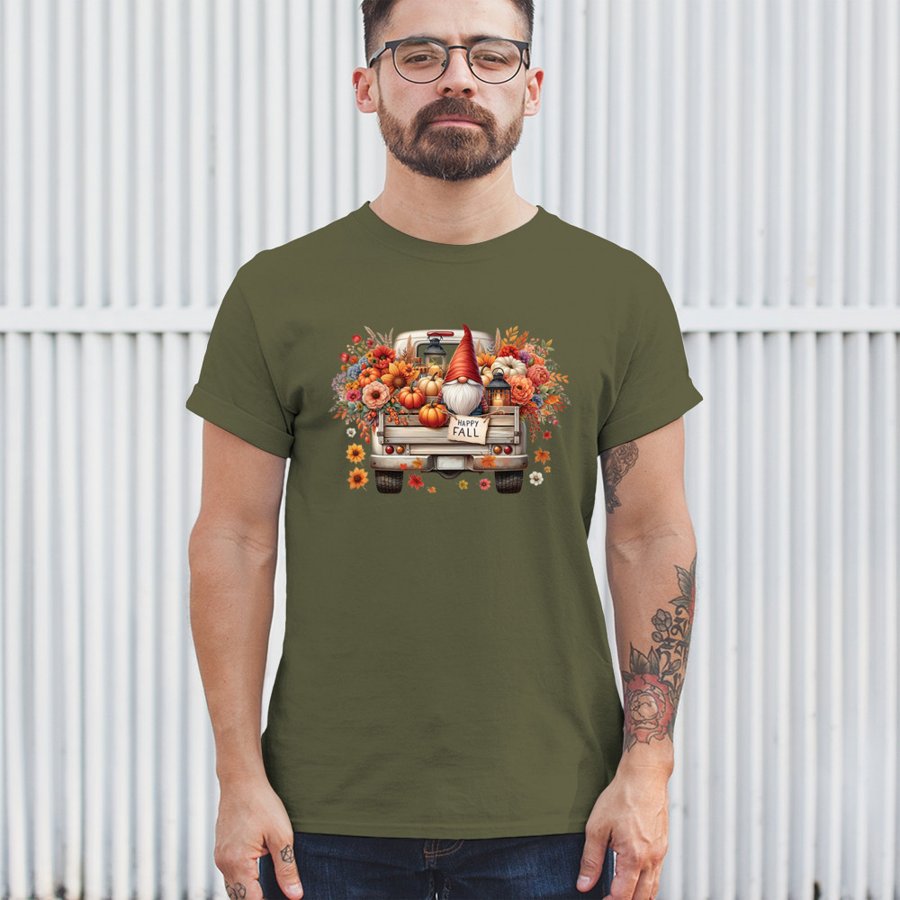 Rustic gnome truck design with pumpkins, wildflowers, and lantern glow. Perfect for Thanksgiving Day, farmhouse harvest, and cozy autumn style.
