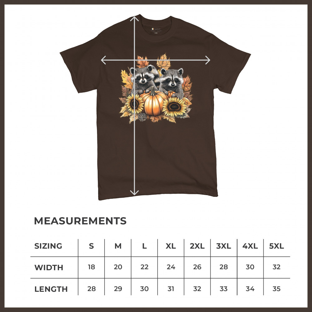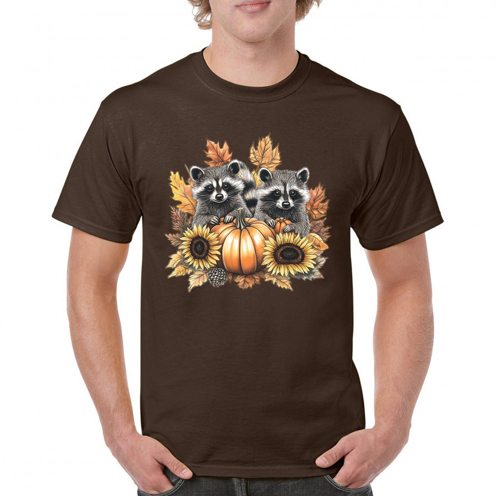 Rustic autumn raccoon design with pumpkins and sunflowers. Perfect for Thanksgiving, pumpkin patch days, farmhouse harvest, and woodland fall fashion.
