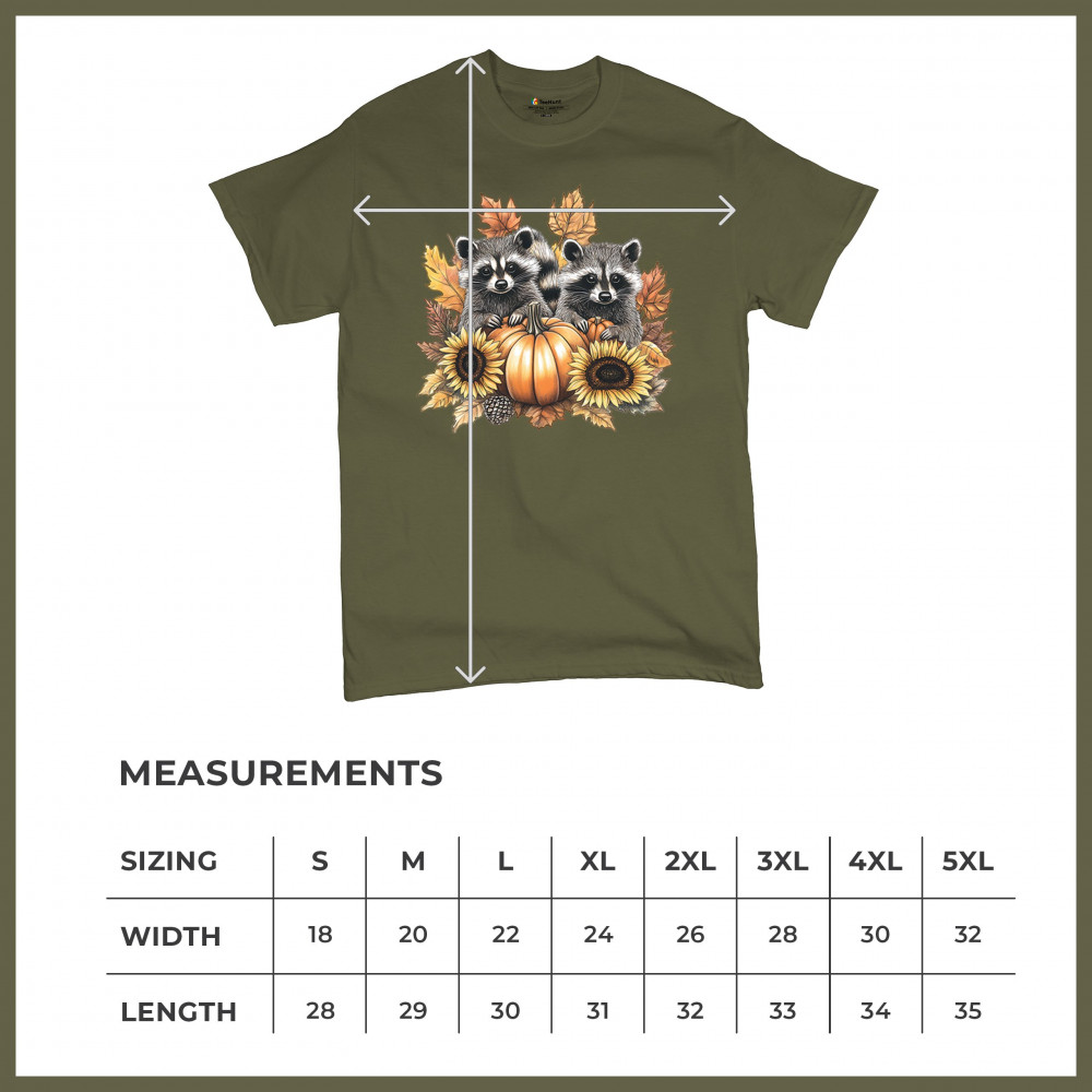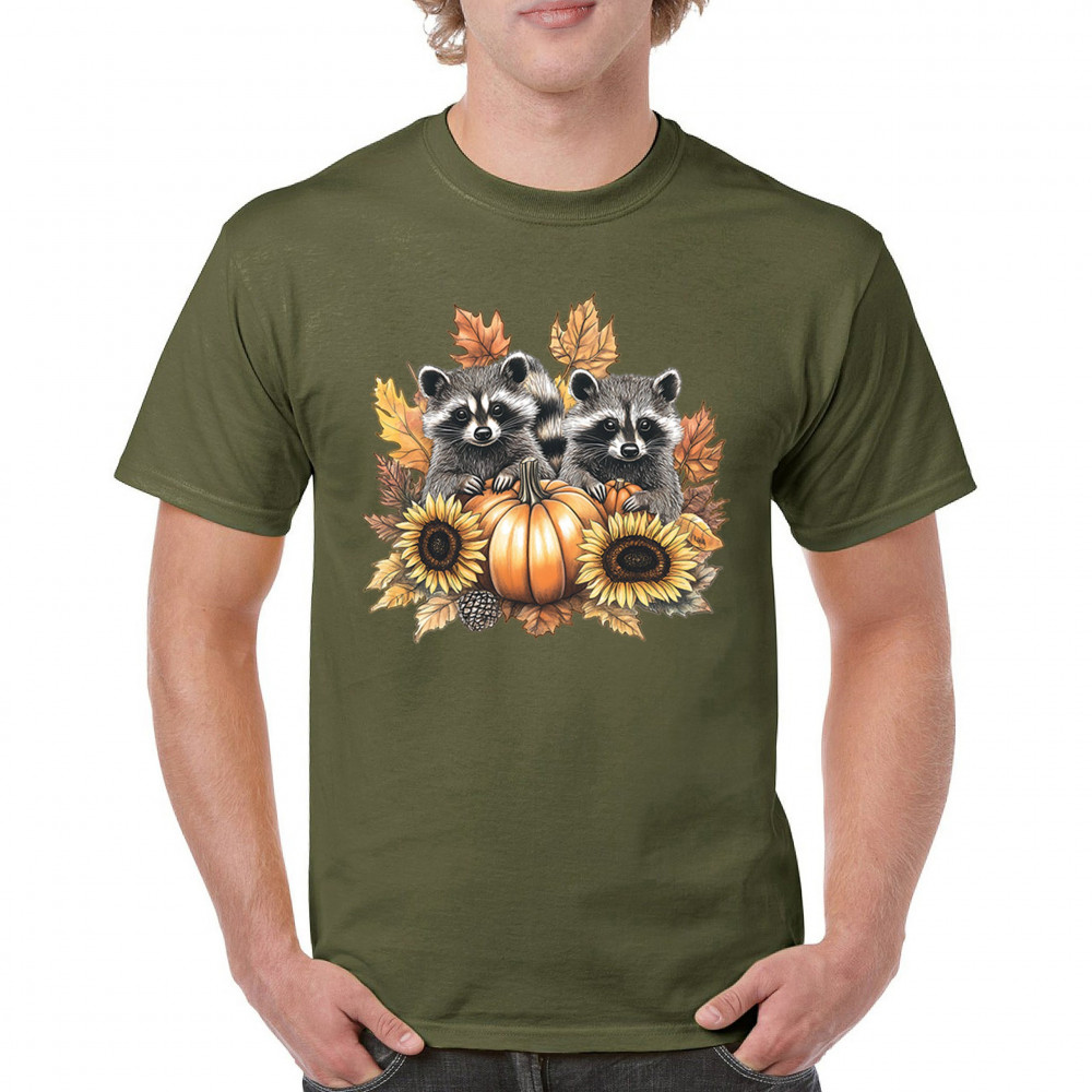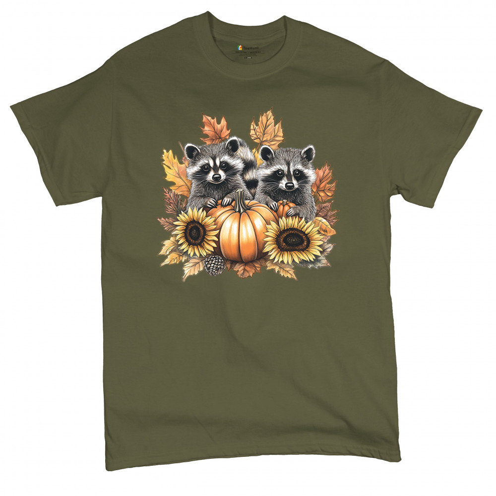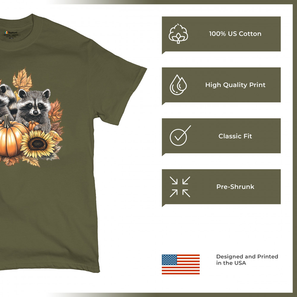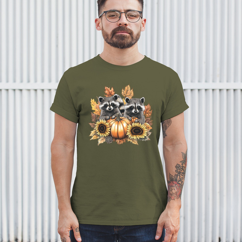 Rustic autumn raccoon design with pumpkins and sunflowers. Perfect for Thanksgiving, pumpkin patch days, farmhouse harvest, and woodland fall fashion.