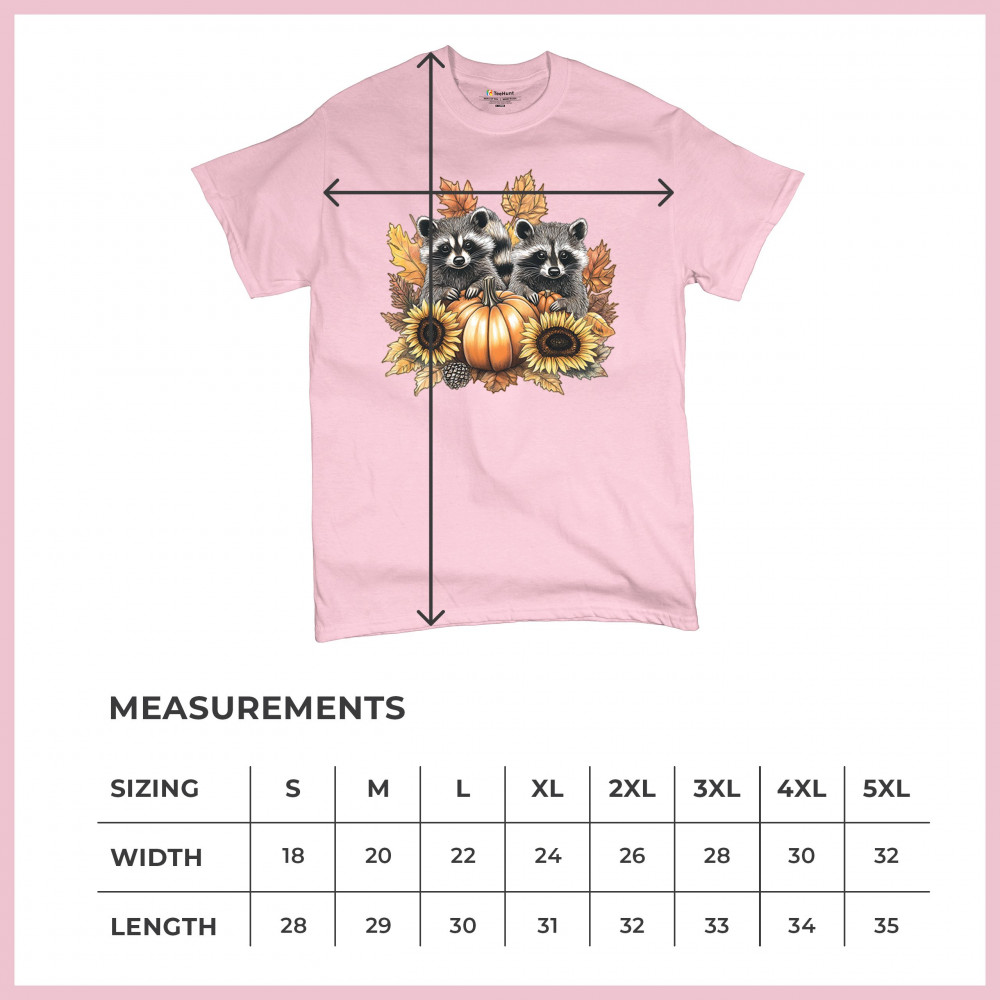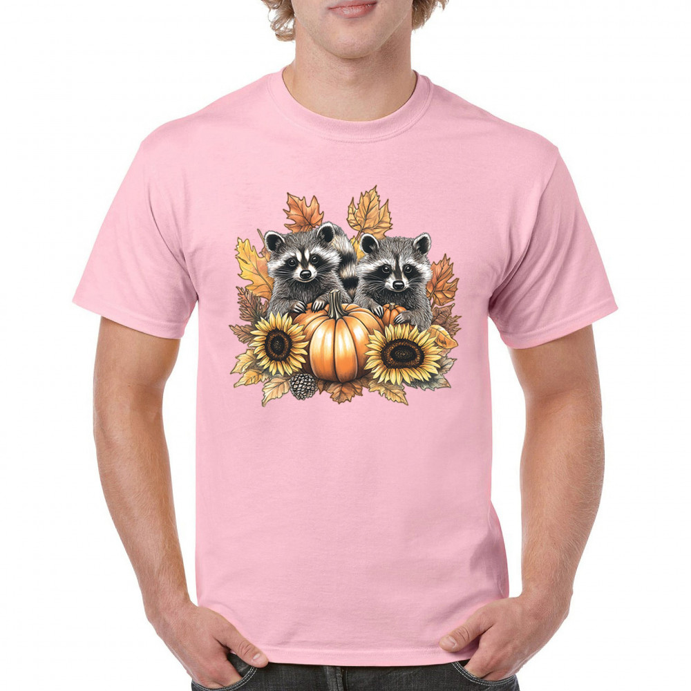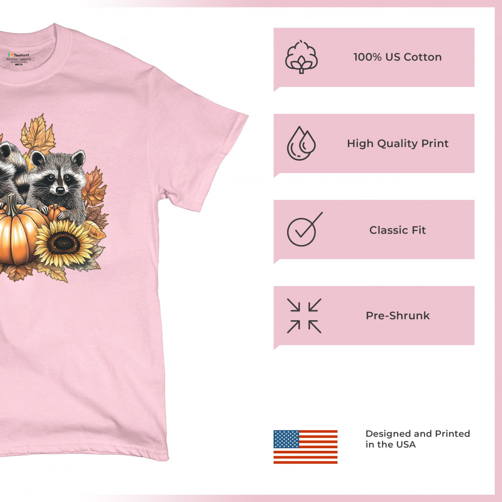 Rustic autumn raccoon design with pumpkins and sunflowers. Perfect for Thanksgiving, pumpkin patch days, farmhouse harvest, and woodland fall fashion.