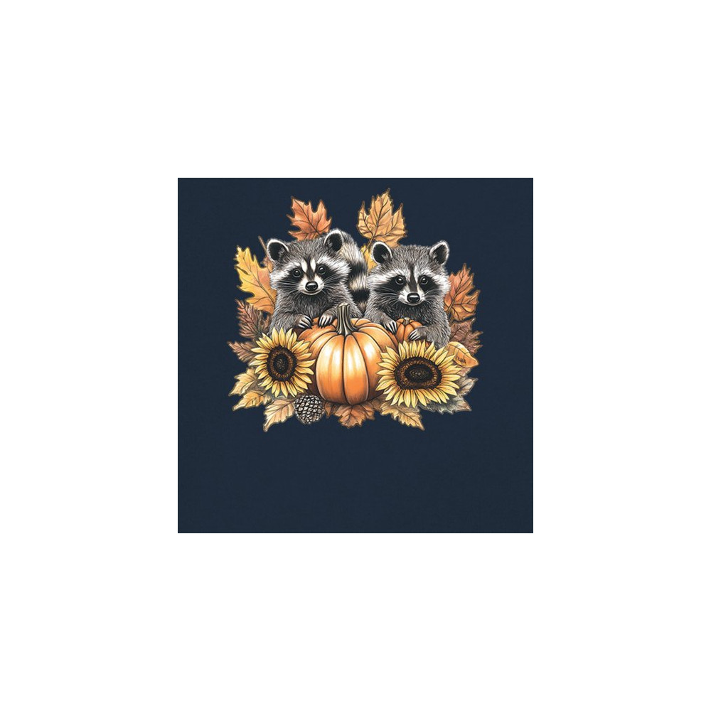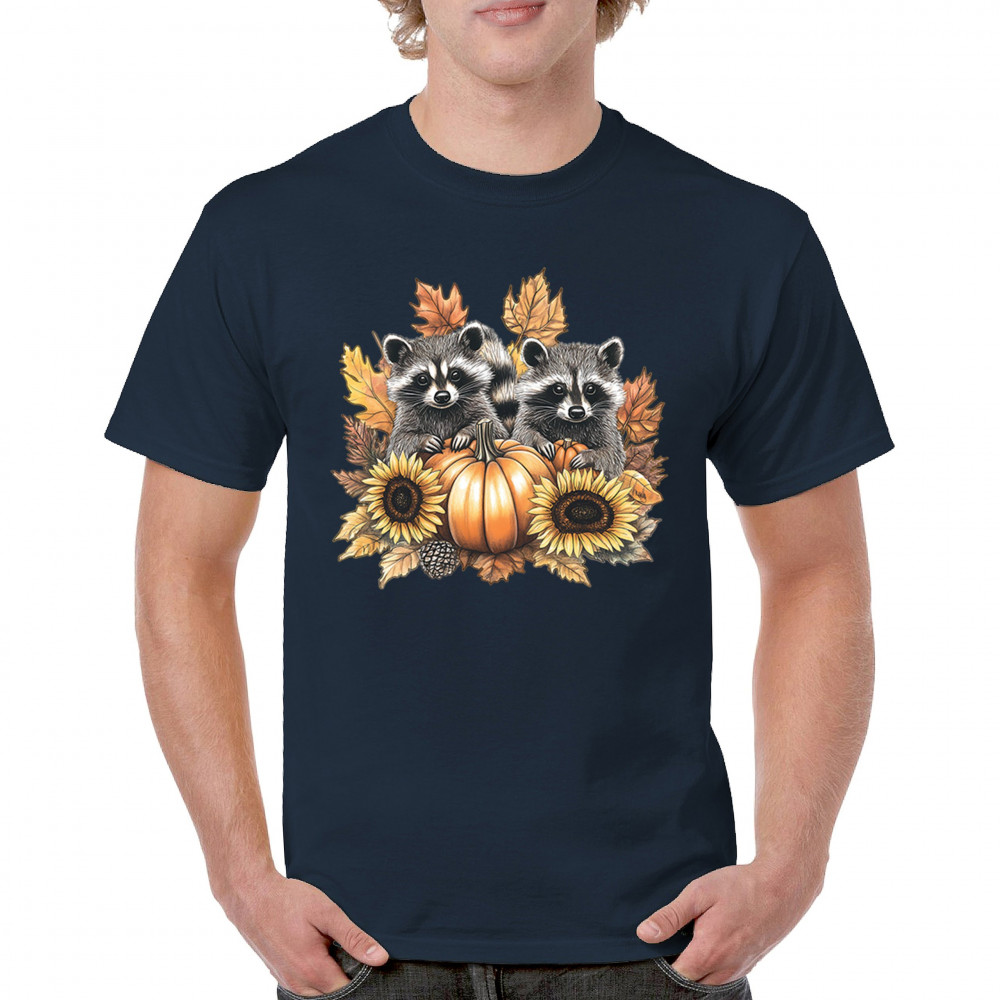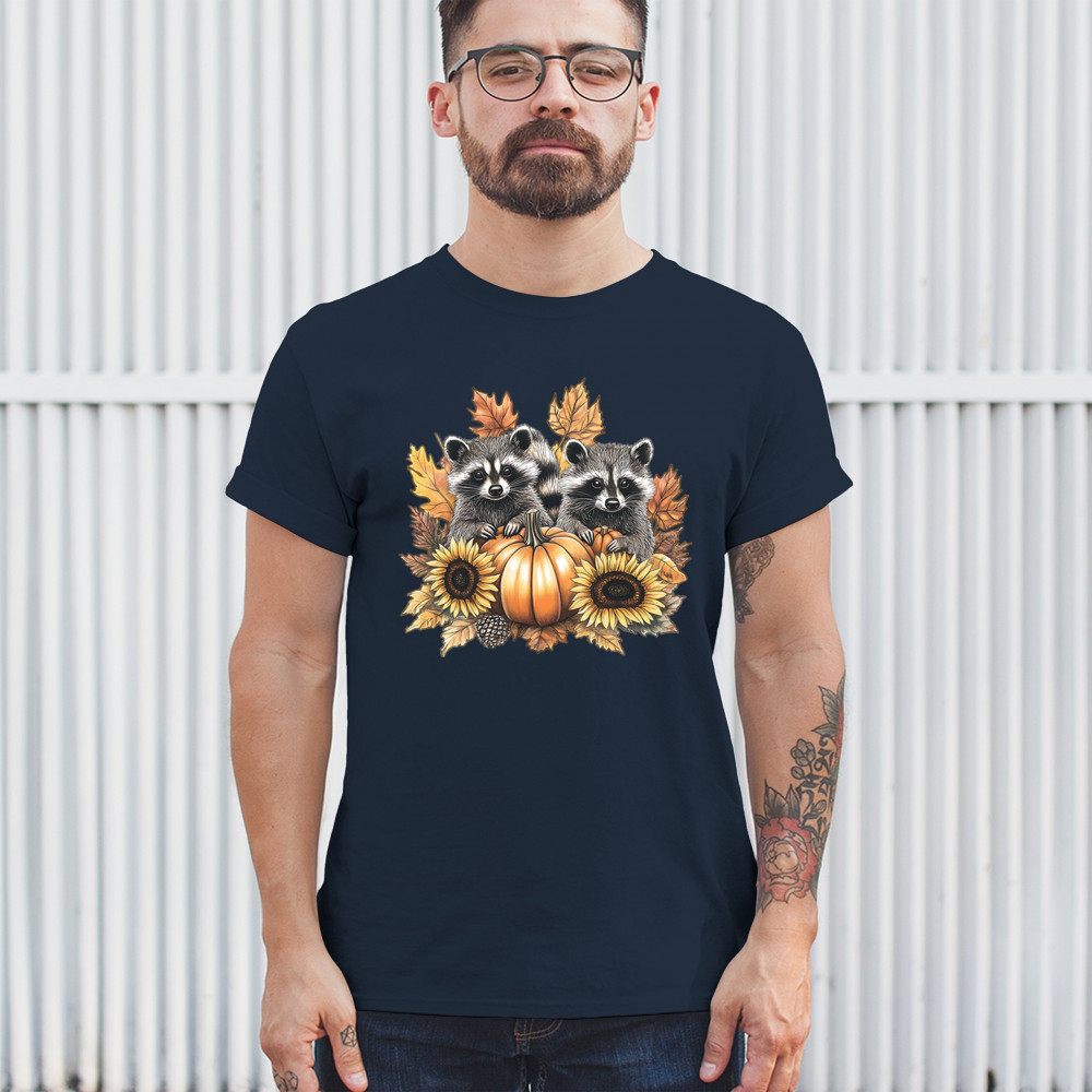 Rustic autumn raccoon design with pumpkins and sunflowers. Perfect for Thanksgiving, pumpkin patch days, farmhouse harvest, and woodland fall fashion.