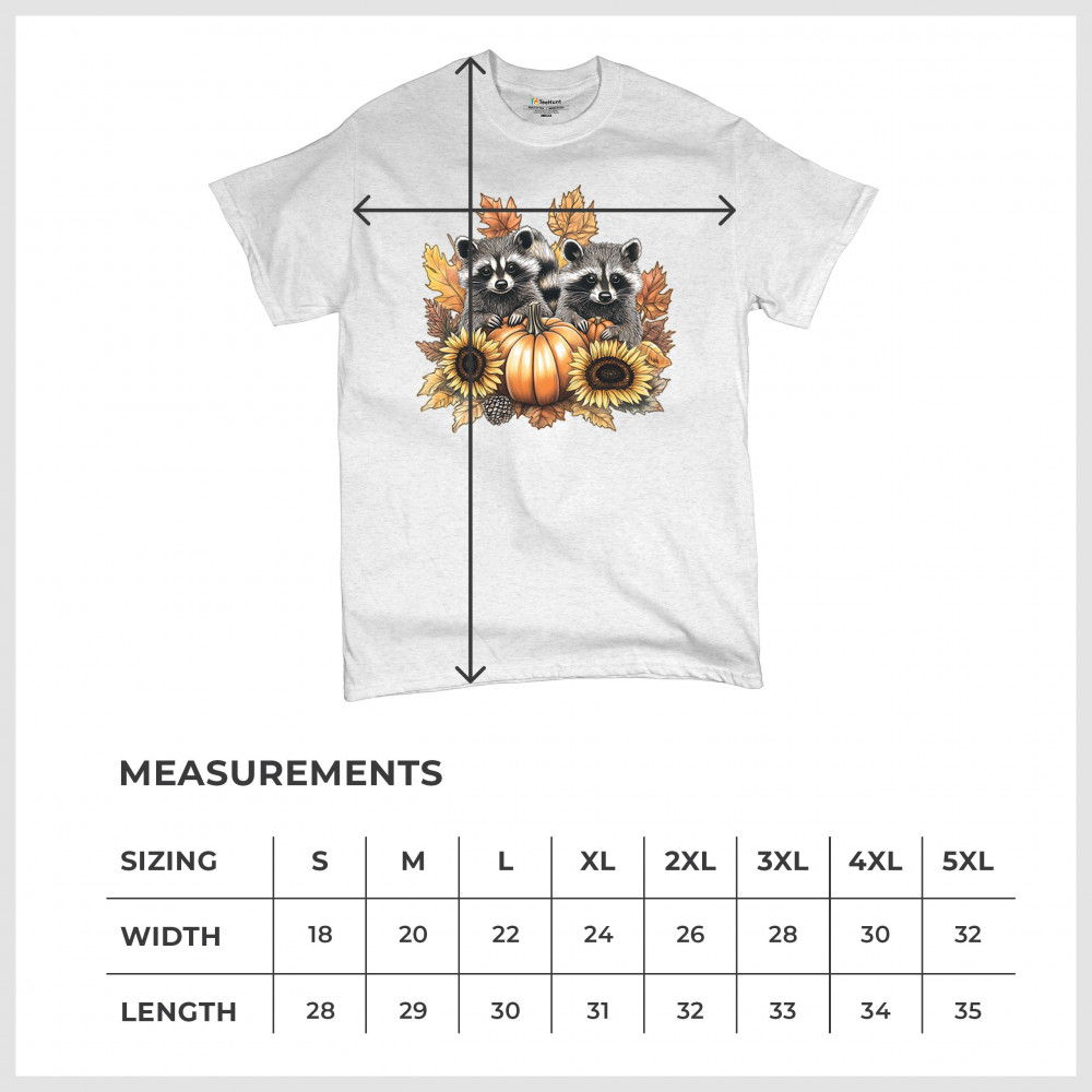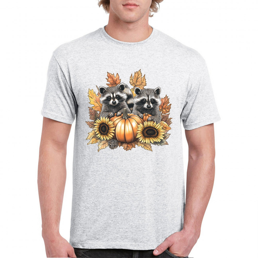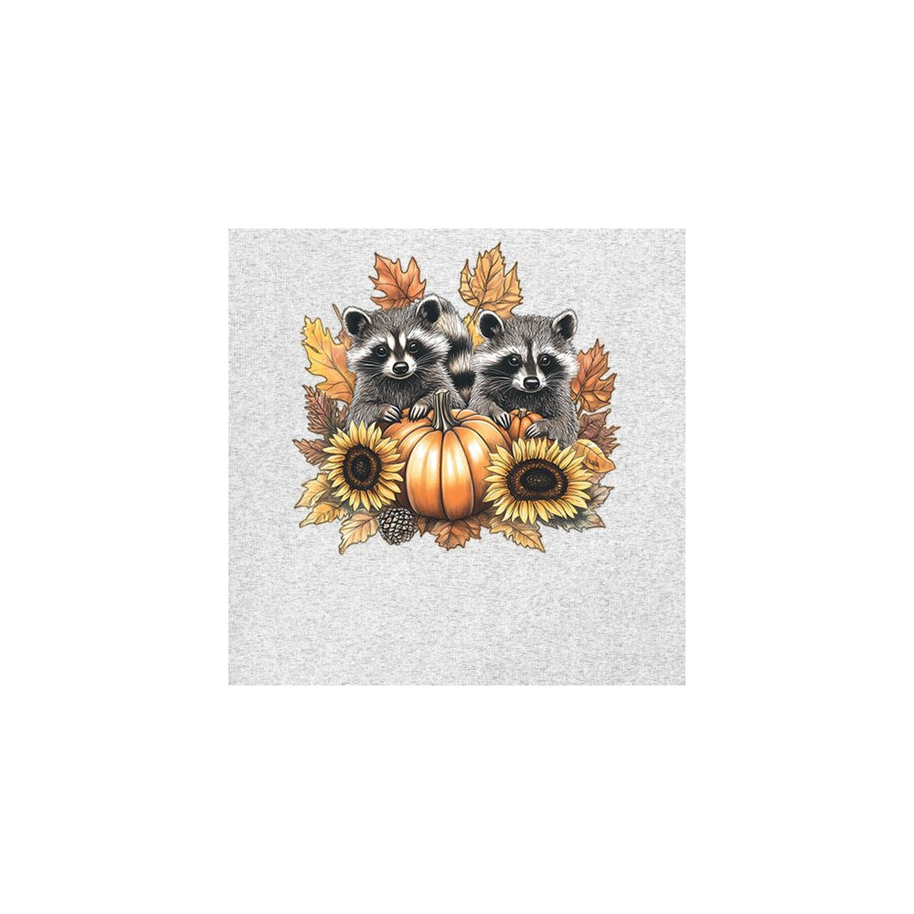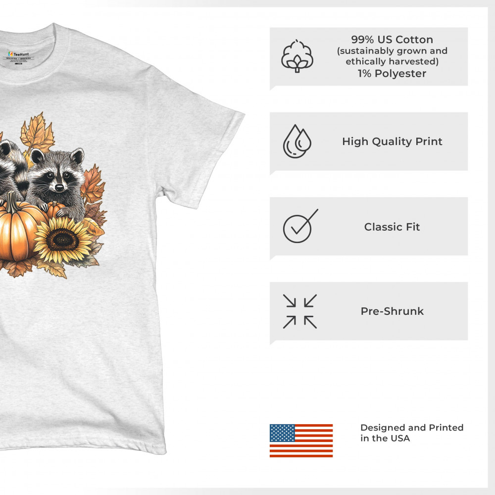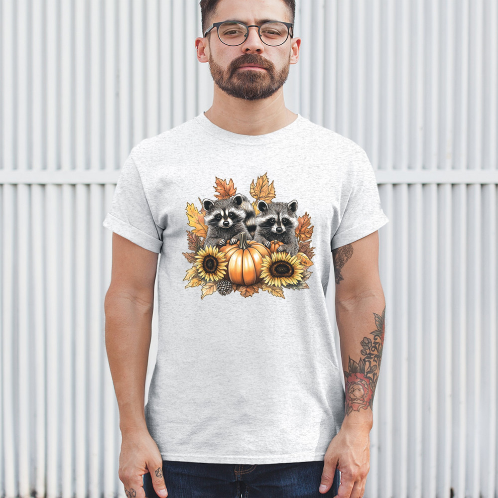 Rustic autumn raccoon design with pumpkins and sunflowers. Perfect for Thanksgiving, pumpkin patch days, farmhouse harvest, and woodland fall fashion.
