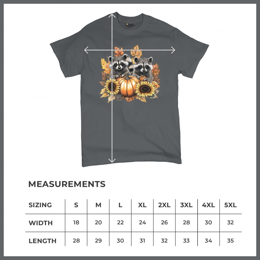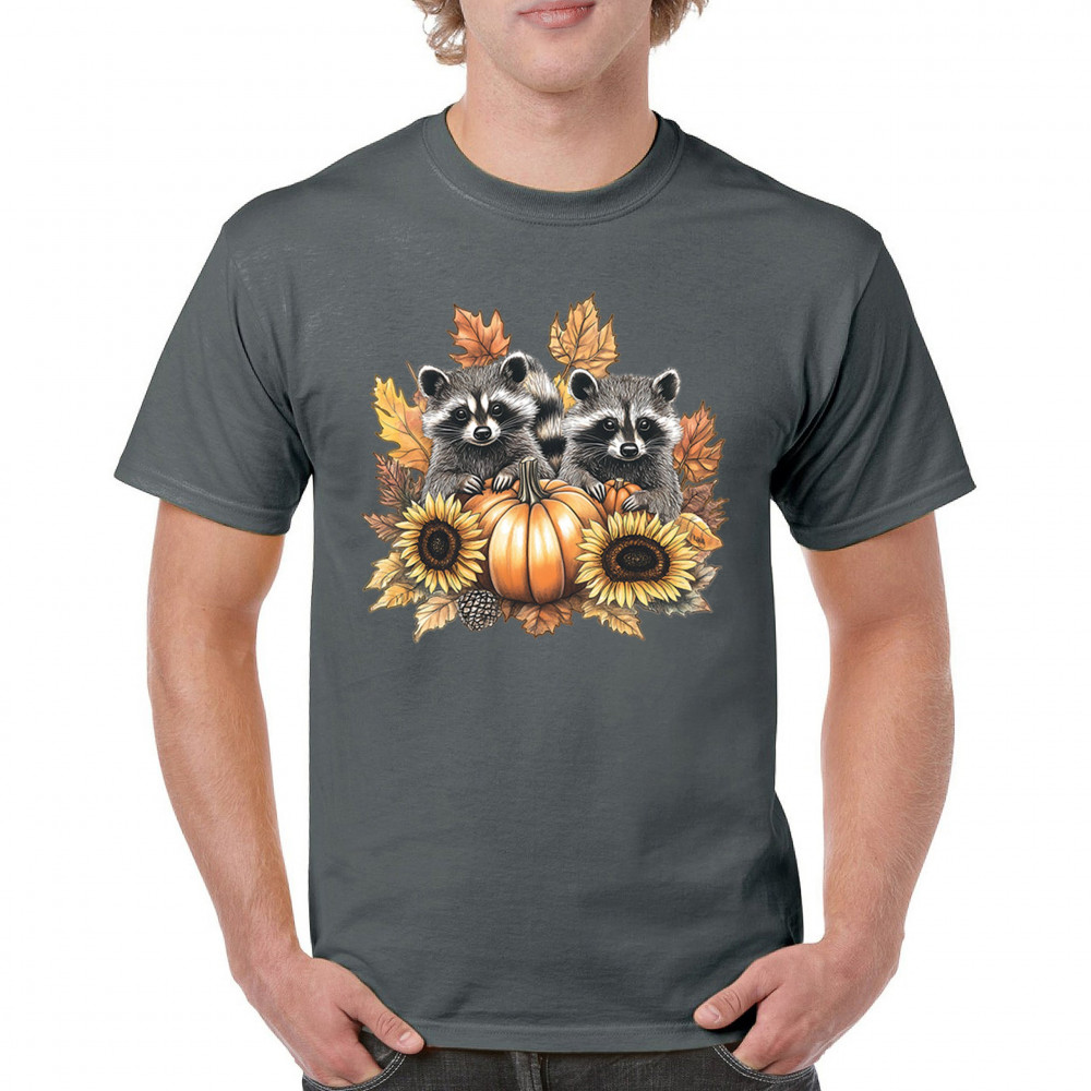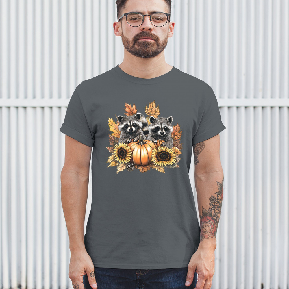 Rustic autumn raccoon design with pumpkins and sunflowers. Perfect for Thanksgiving, pumpkin patch days, farmhouse harvest, and woodland fall fashion.