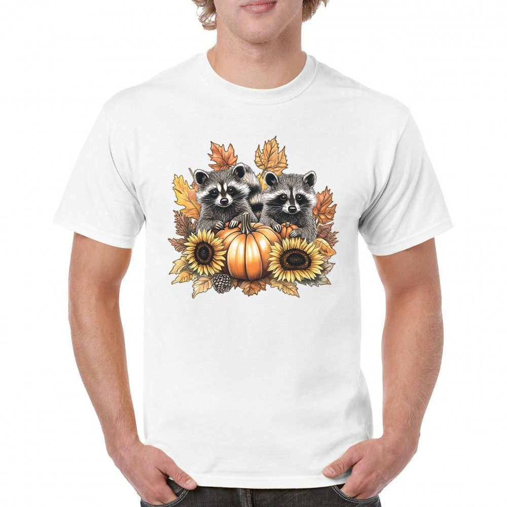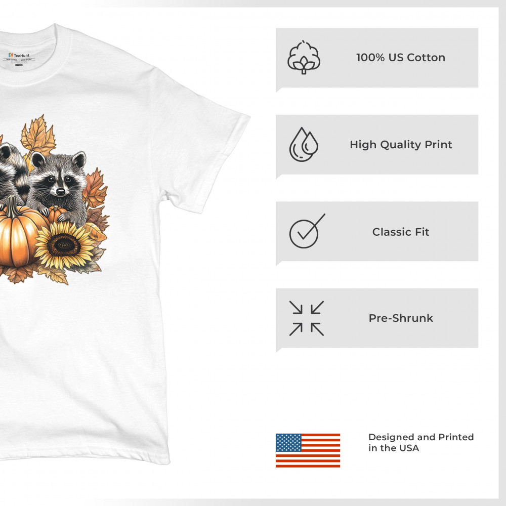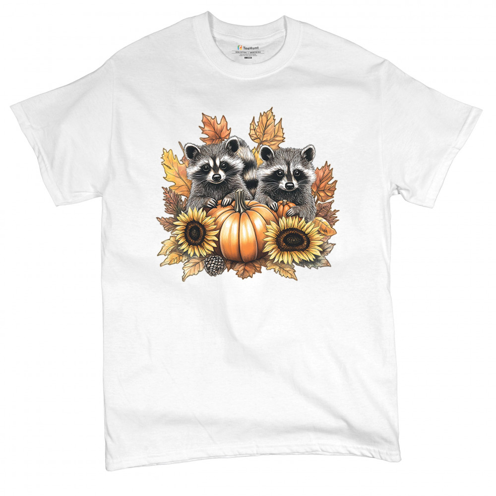 Rustic autumn raccoon design with pumpkins and sunflowers. Perfect for Thanksgiving, pumpkin patch days, farmhouse harvest, and woodland fall fashion.
