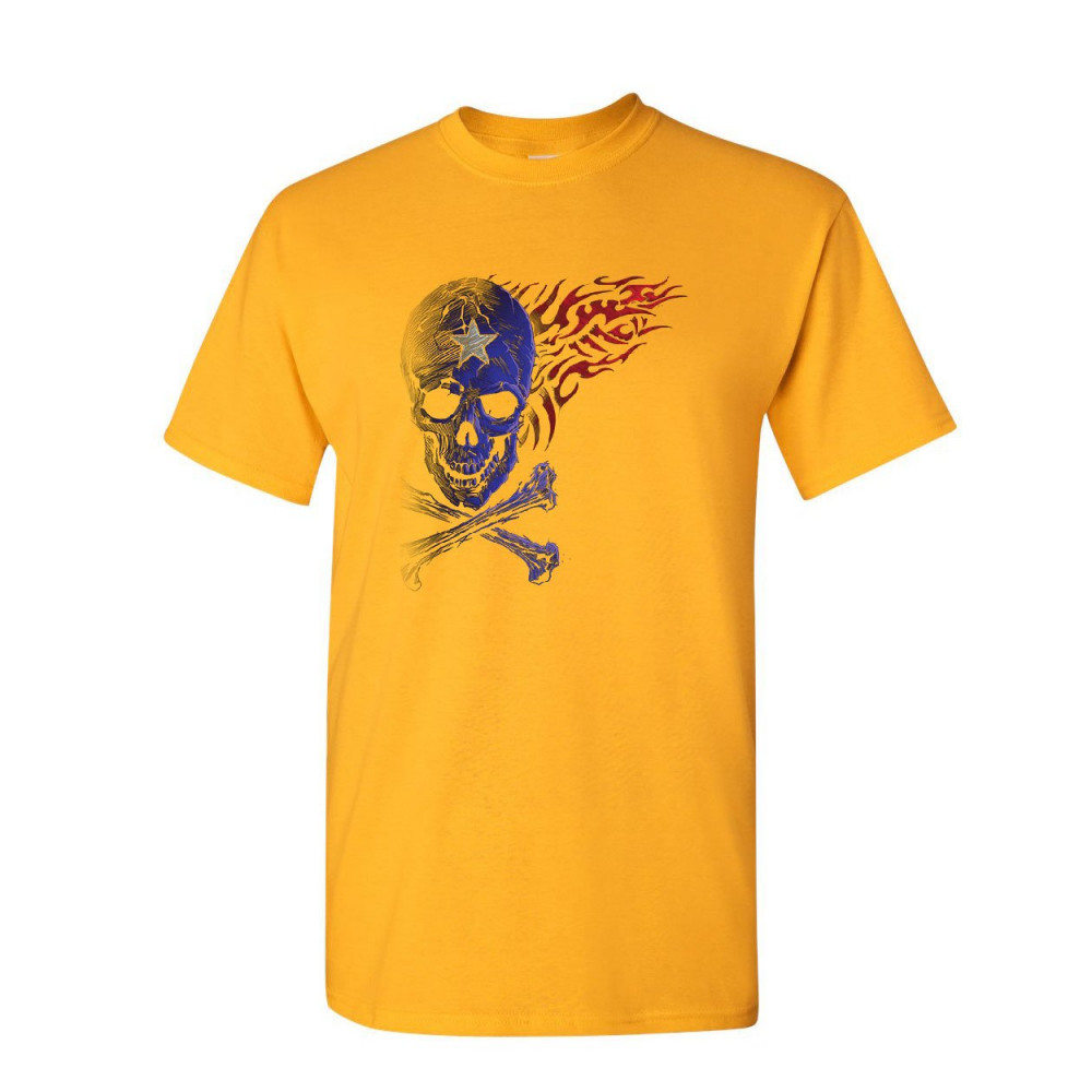 SKULL FACE WITH CROSSBONES fantacycle skull crossbones t-shirt american pride tribal flame mens tee shirt yellow