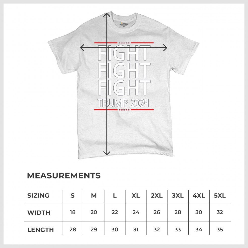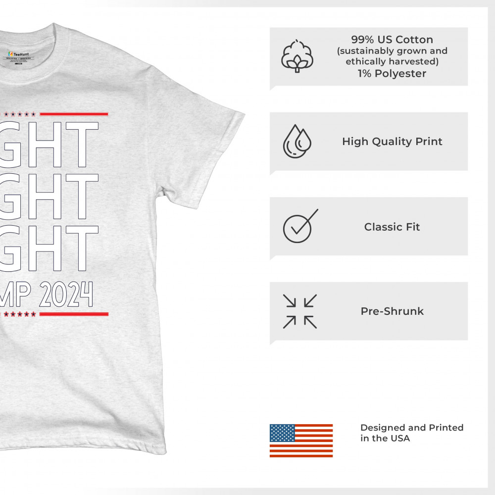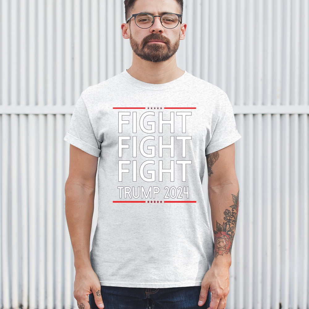 Show your Trump 2024 support with this bold "Fight Fight Fight" design. Perfect for rallies and everyday wear. Stand with America!