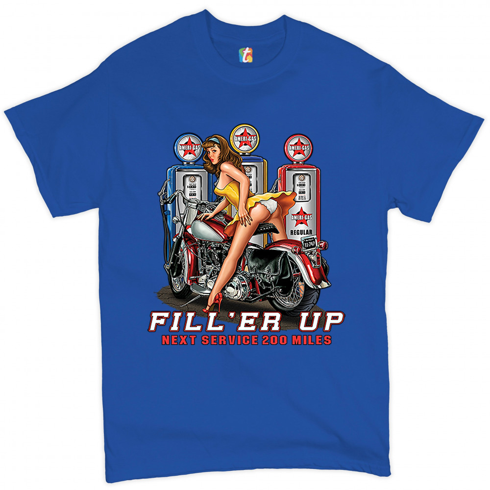 FILL 'ER UP t-shirt sexy pin-up girl biker rider live to ride men's tee royal blue