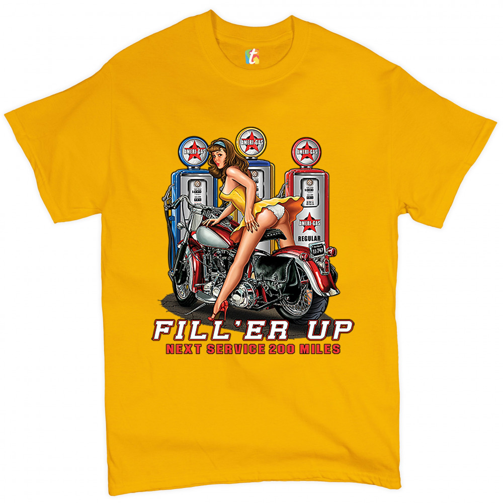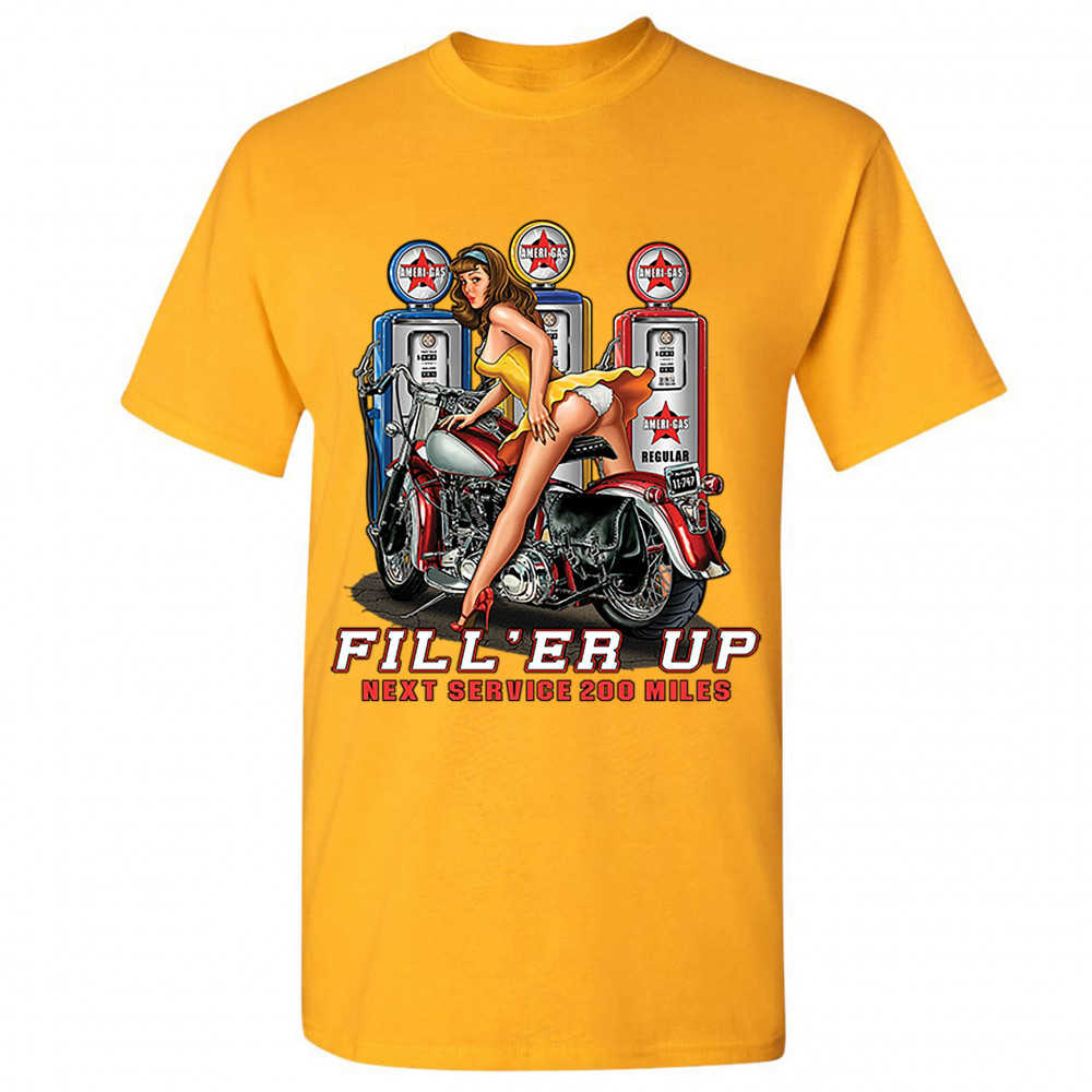 FILL 'ER UP t-shirt sexy pin-up girl biker rider live to ride men's tee yellow