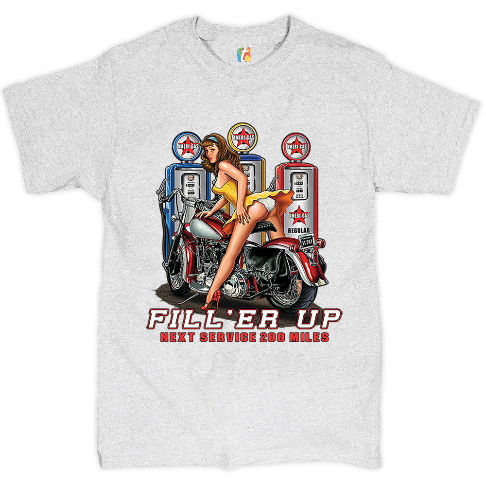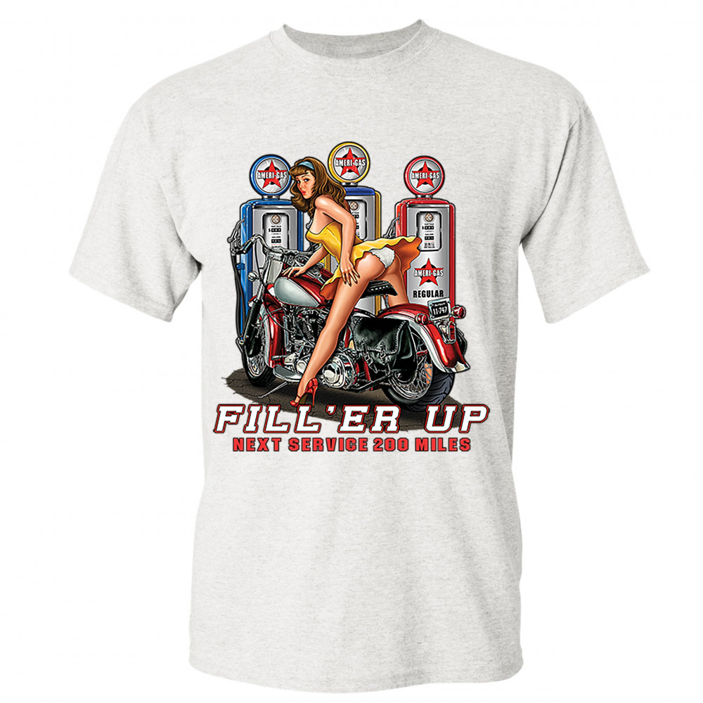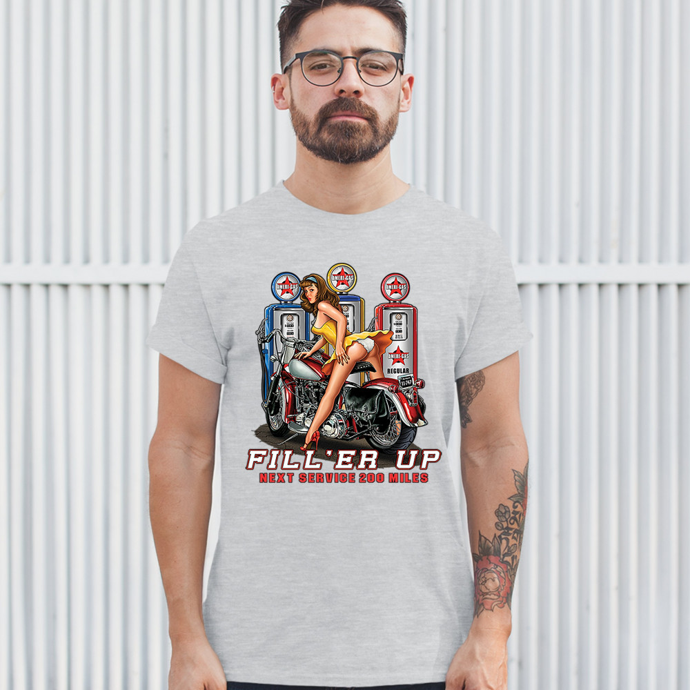 FILL 'ER UP t-shirt sexy pin-up girl biker rider live to ride men's tee ash gray