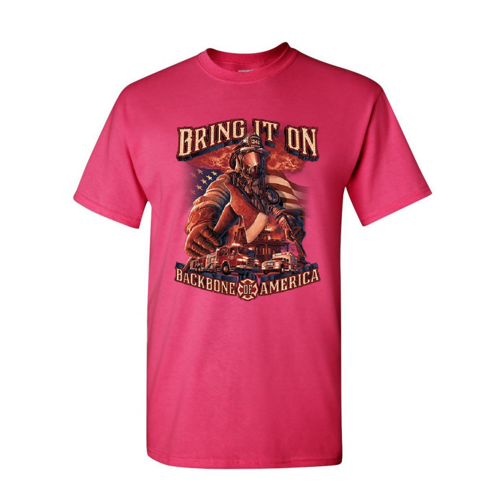 FIREFIGHTER BACKBONE OF AMERICA t-shirt fd fire and rescue hero mens tee shirt hot pink