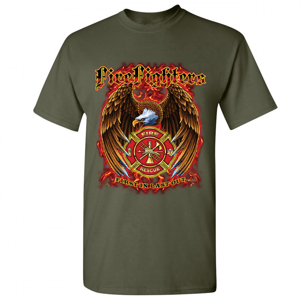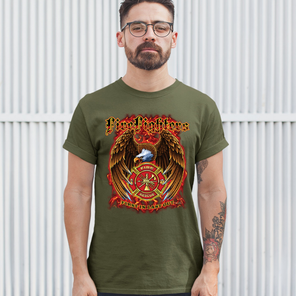FIREFIGHTERS FIRST IN LAST OUT t-shirt fire and rescue bald eagle men's tee military green