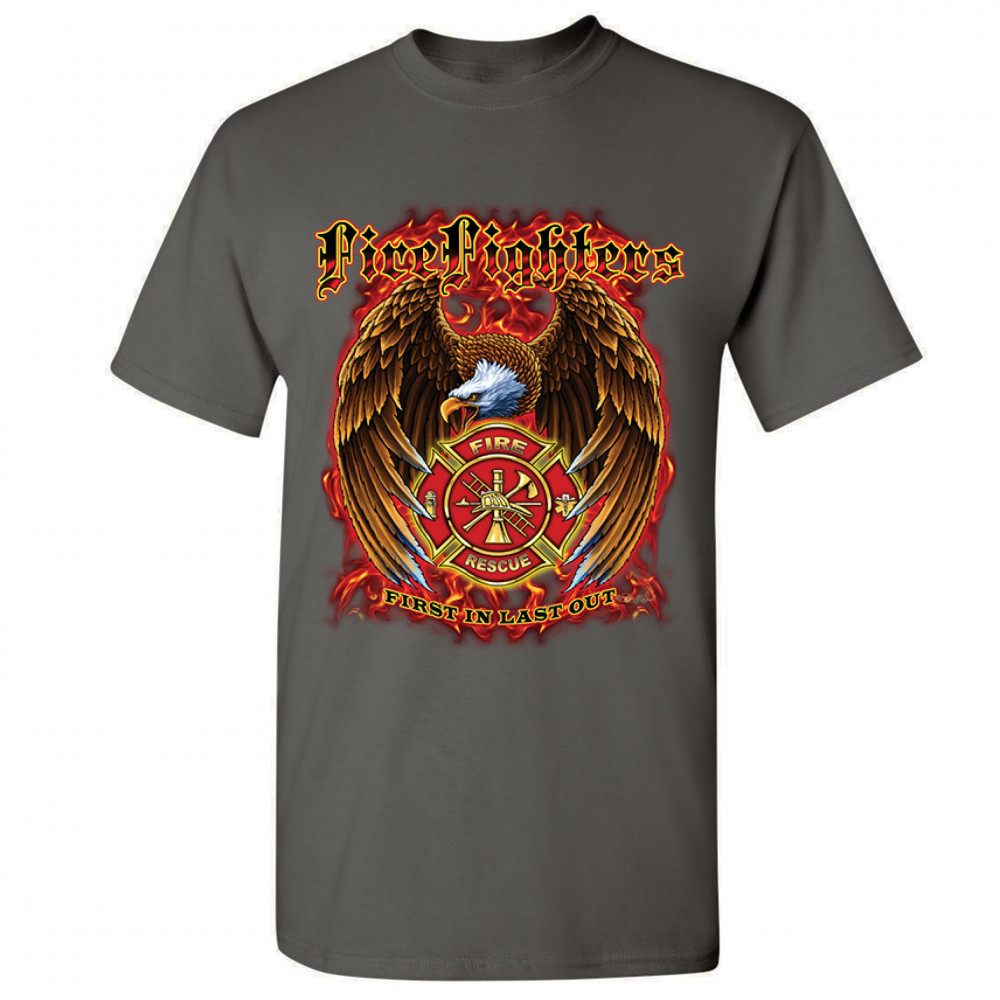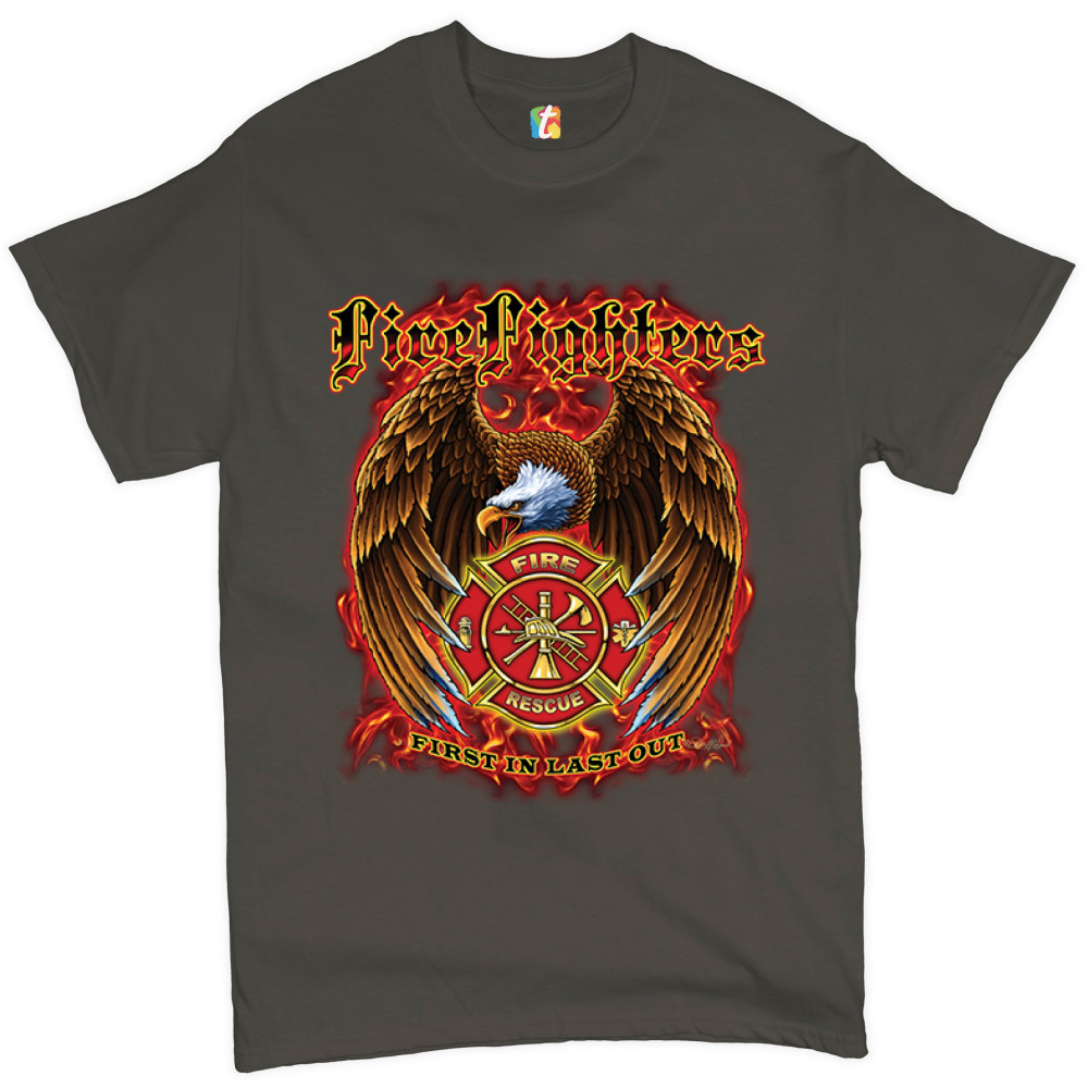 FIREFIGHTERS FIRST IN LAST OUT t-shirt fire and rescue bald eagle men's tee charcoal