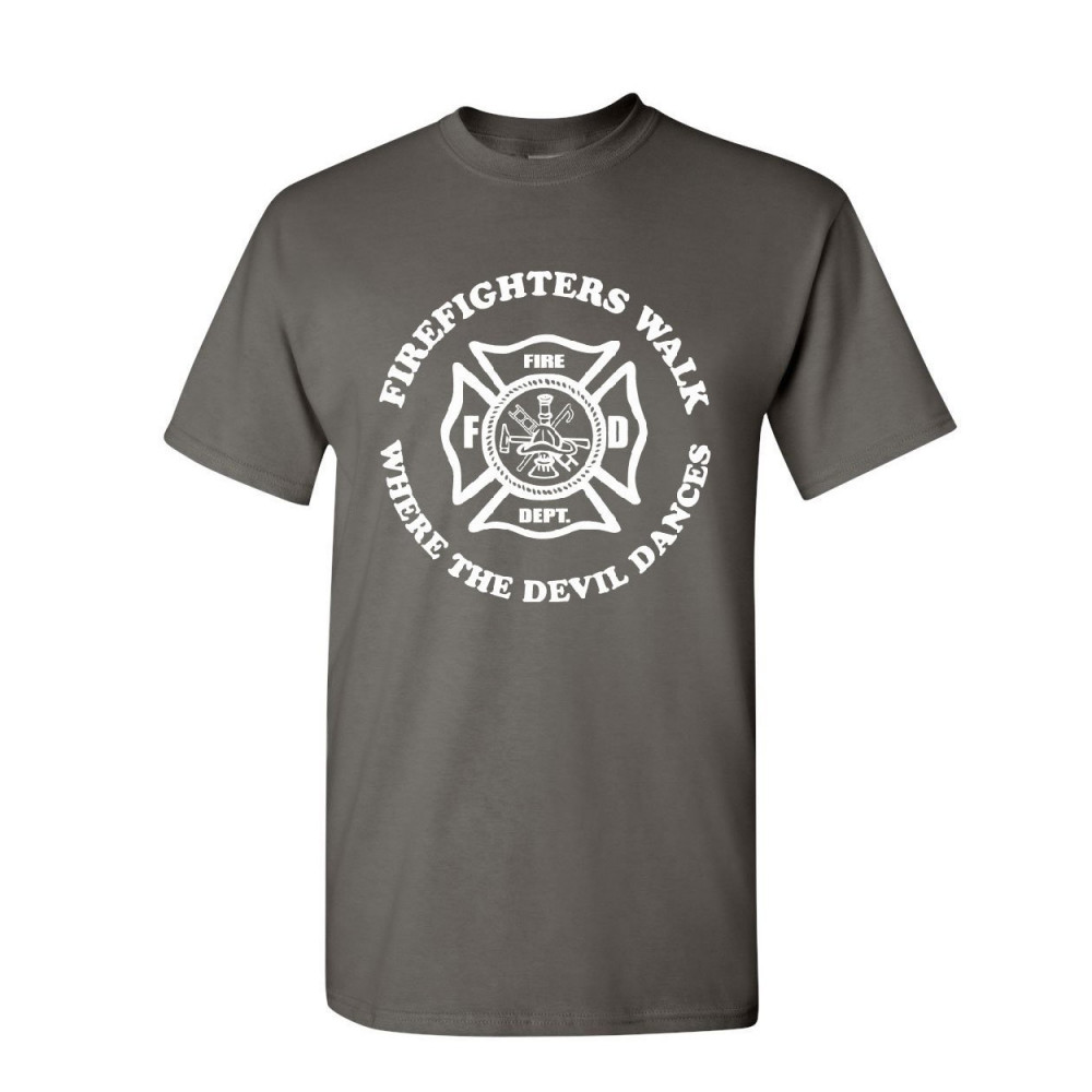 FIREFIGHTERS WALK WHERE DEVIL DANCES t-shirt fire and rescue mens tee shirt charcoal