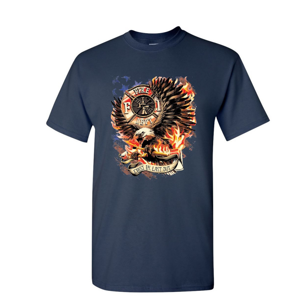 FIREFIGHTER FIRST IN LAST OUT first in last out t-shirt fire & rescue fd american firefighter mens tee shirt navy blue
