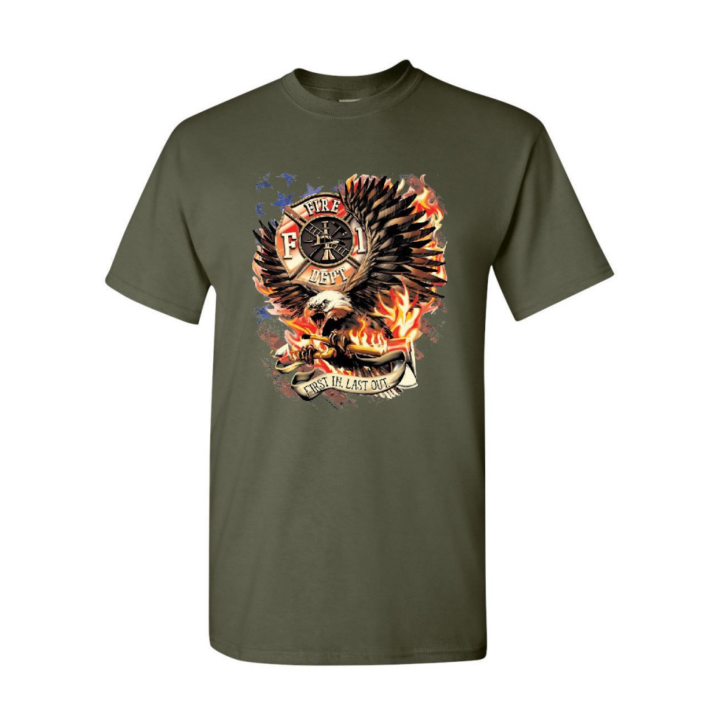 FIREFIGHTER FIRST IN LAST OUT first in last out t-shirt fire & rescue fd american firefighter mens tee shirt military green