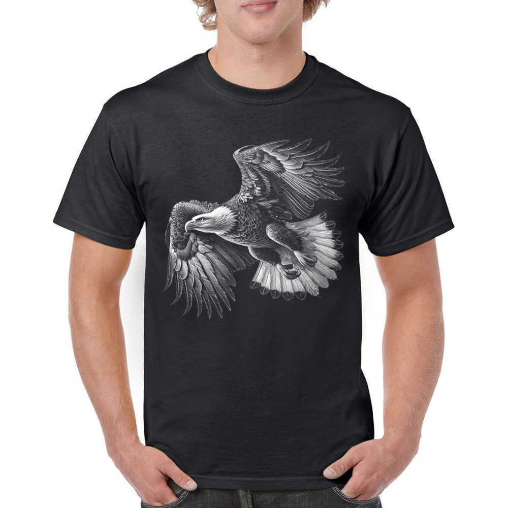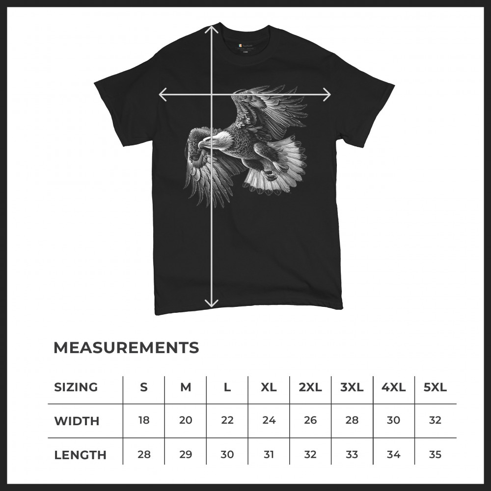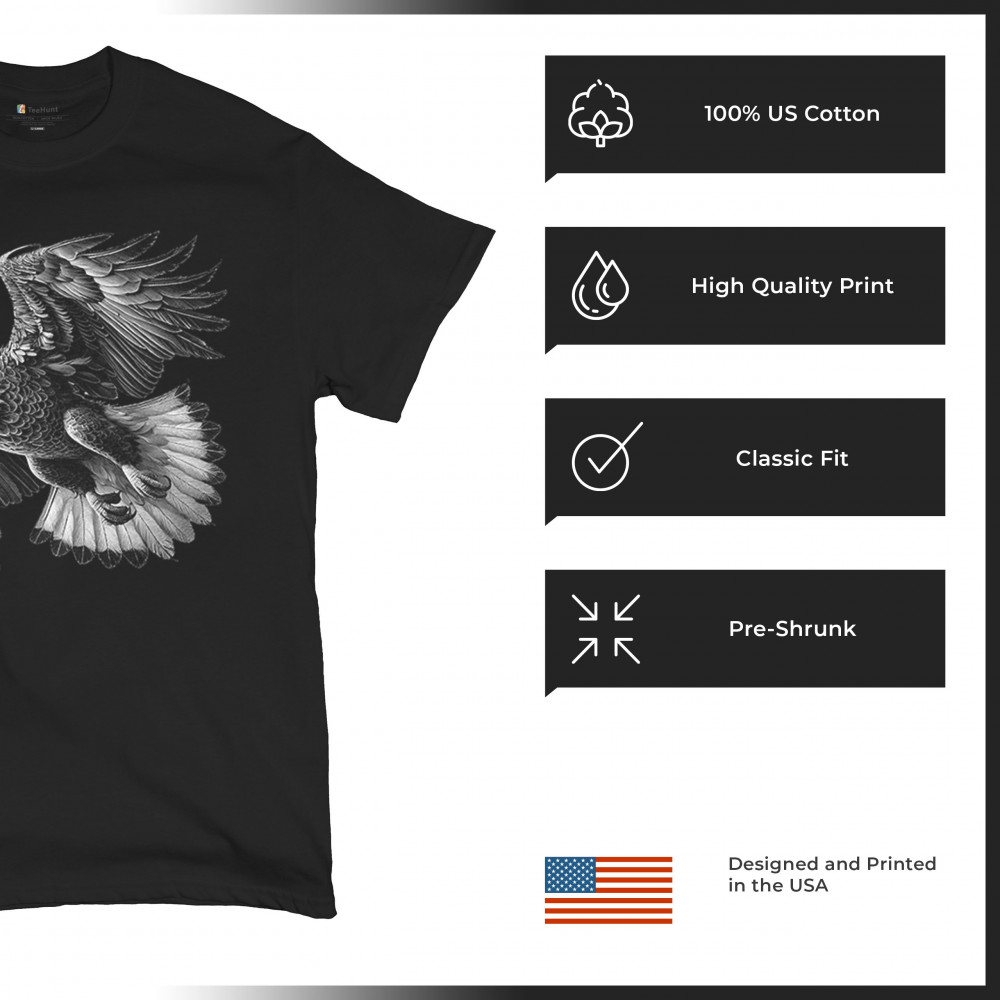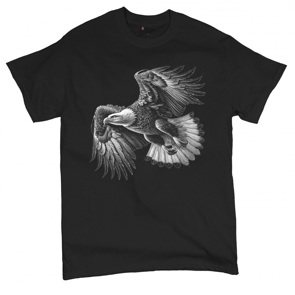 Celebrate American pride with this soaring bald eagle design. With wings extended and monochrome detail that symbolizes liberty and strength, it's perfect for patriots, veterans, and national holiday wear. A timeless tribute to freedom, this design is ideal for memorial events, rallies, and anyone who honors the red, white, and blue.