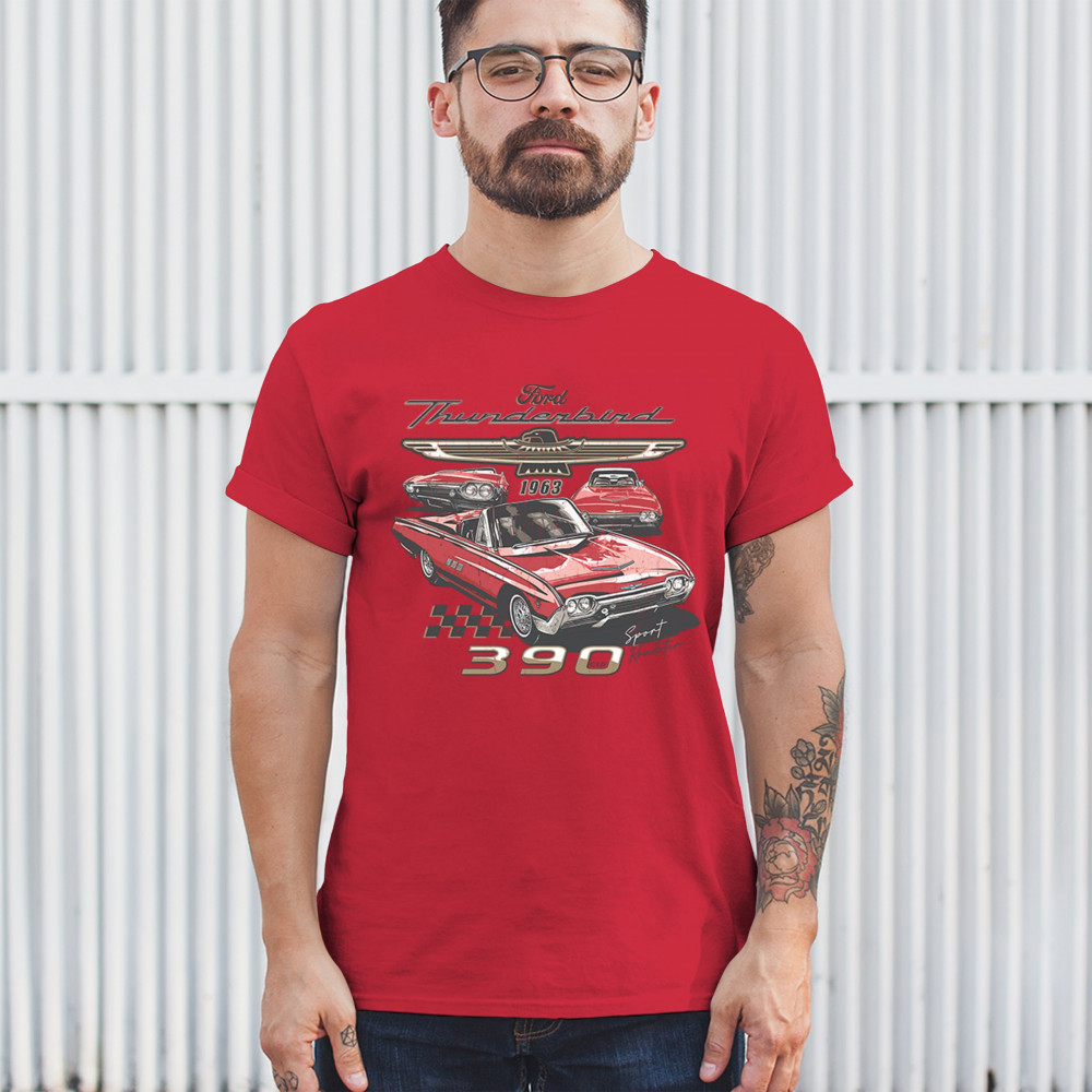 Celebrate the style and power of the 1963 Ford Thunderbird with this striking design featuring the classic 390 V8 Sport Roadster. With its unmistakable red finish and vintage detailing, this piece captures the heart of American auto history. A perfect tribute for Ford fans, car collectors, and retro cruising lovers.