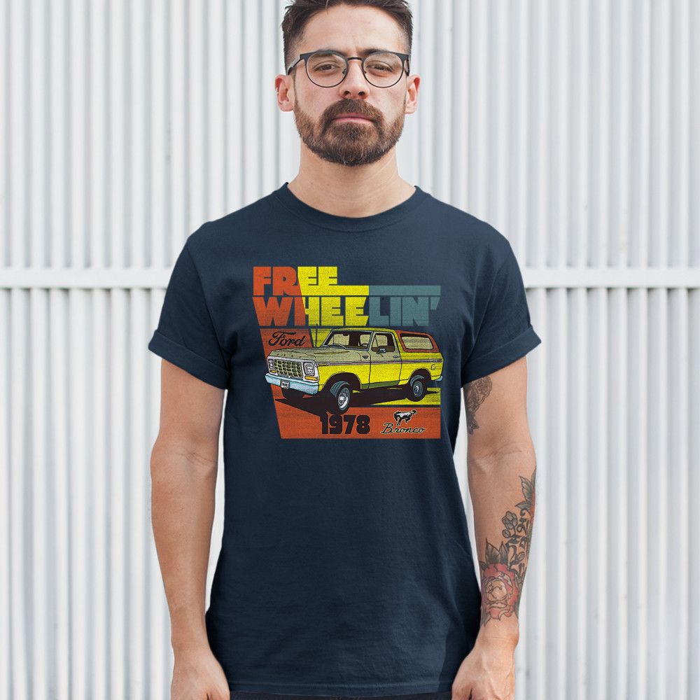 FORD BRONCO 1978 t-shirt free wheelin' offroad truck suv licensed men's tee navy blue
