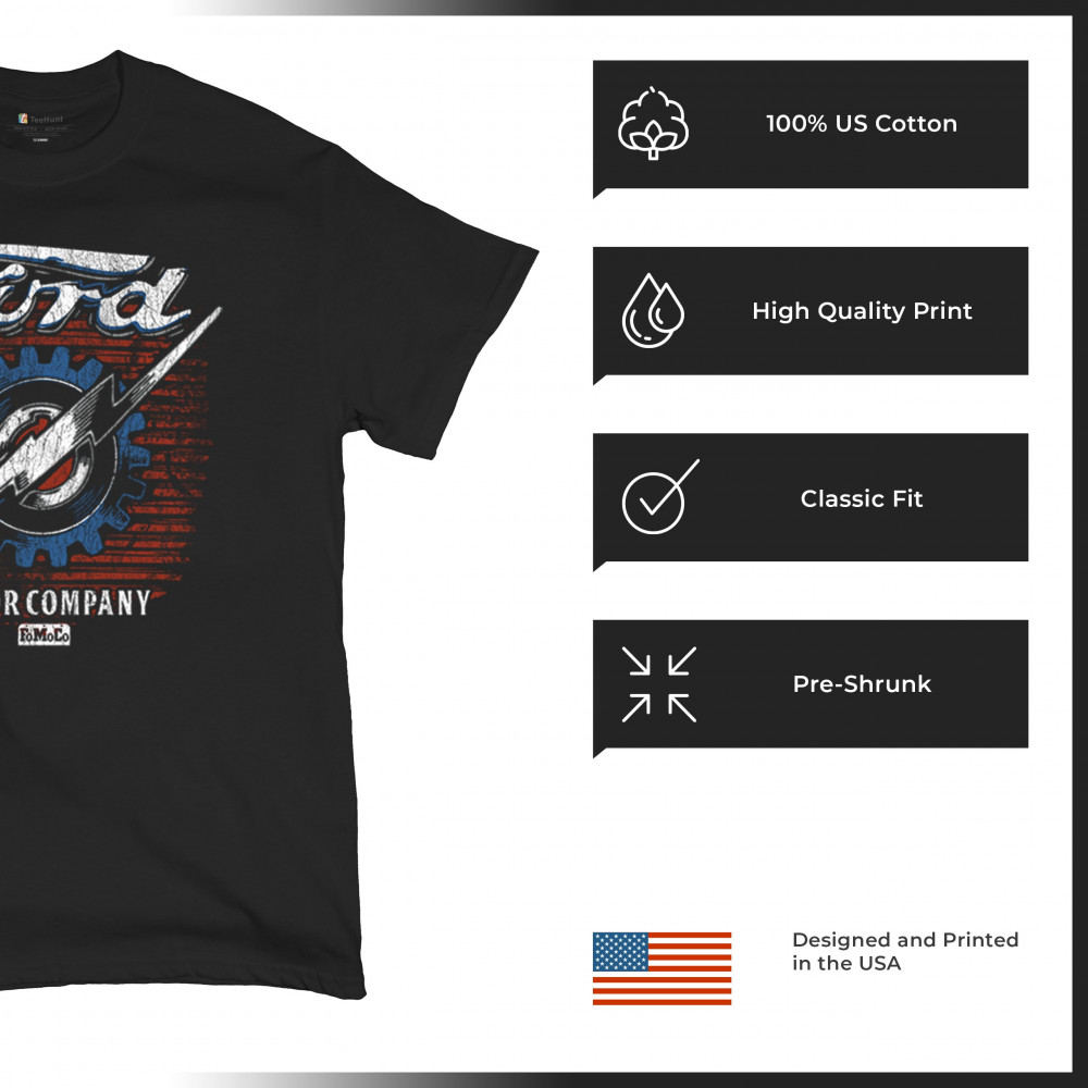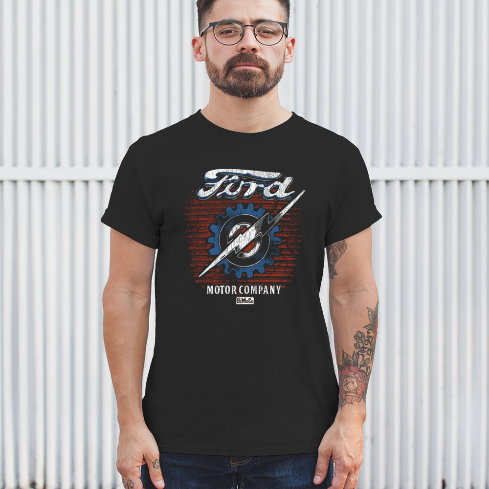 This officially licensed Ford Motor Company design showcases a distressed patriotic theme, bold lightning bolt, and vintage industrial gear emblem, symbolizing the power of American automotive innovation. Perfect for classic car lovers, muscle car enthusiasts, and Ford history fans, this design pays tribute to high-performance heritage, FoMoCo branding, and the legacy of American muscle.