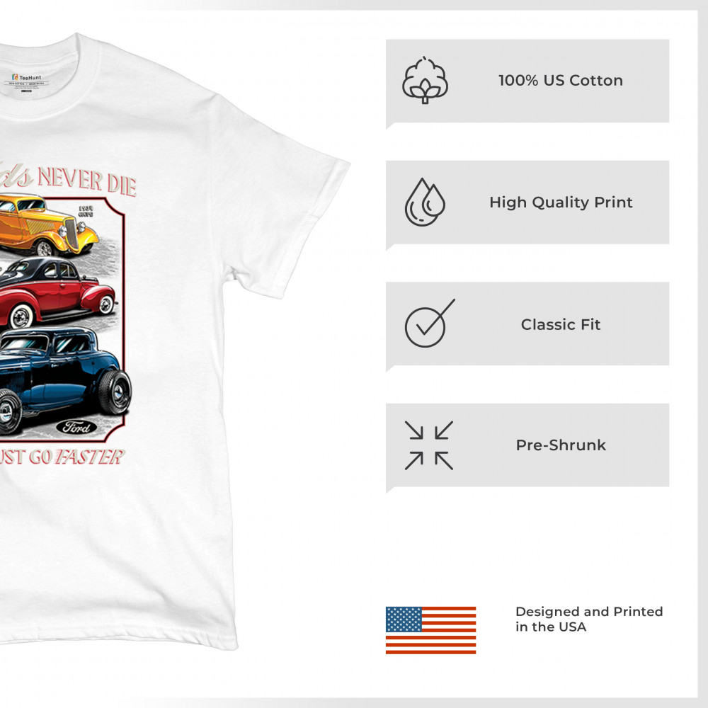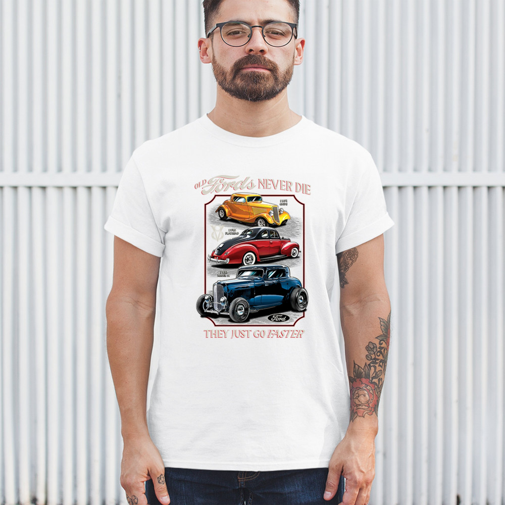 This retro design features three legendary Ford hot rods from the 1930s and 1940s, boldly rendered in a tribute to American street rod history. Ideal for muscle car lovers, vintage performance fans, and classic car culture enthusiasts who appreciate timeless speed. A must-have for cruise nights, garage hangs, and car shows.