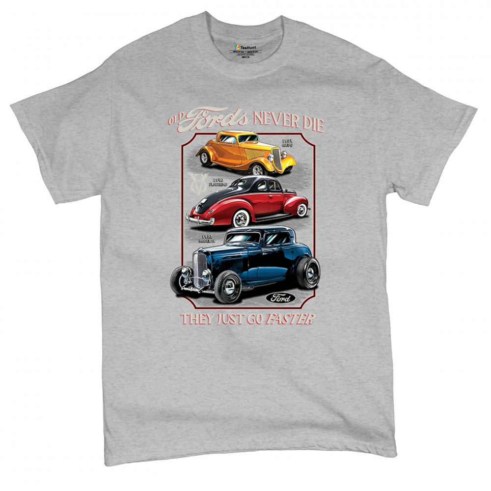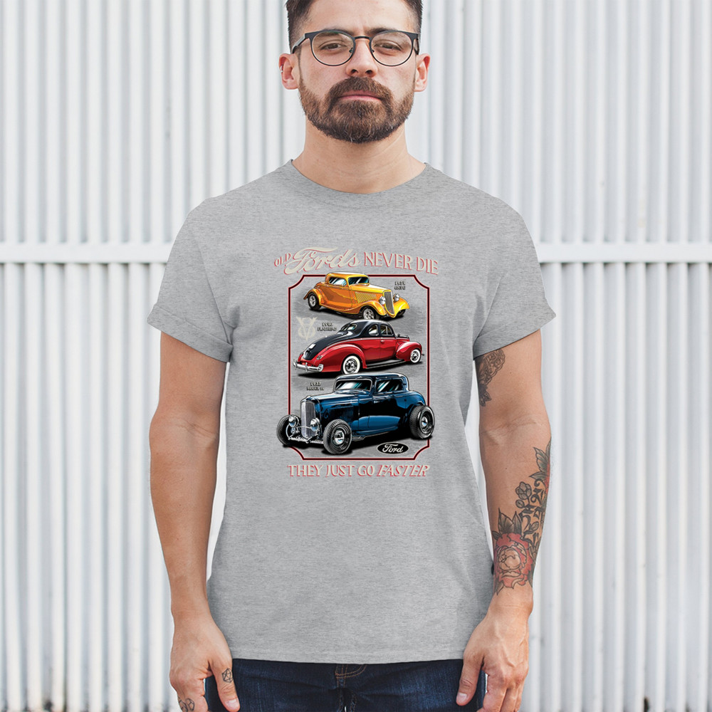 This retro design features three legendary Ford hot rods from the 1930s and 1940s, boldly rendered in a tribute to American street rod history. Ideal for muscle car lovers, vintage performance fans, and classic car culture enthusiasts who appreciate timeless speed. A must-have for cruise nights, garage hangs, and car shows.