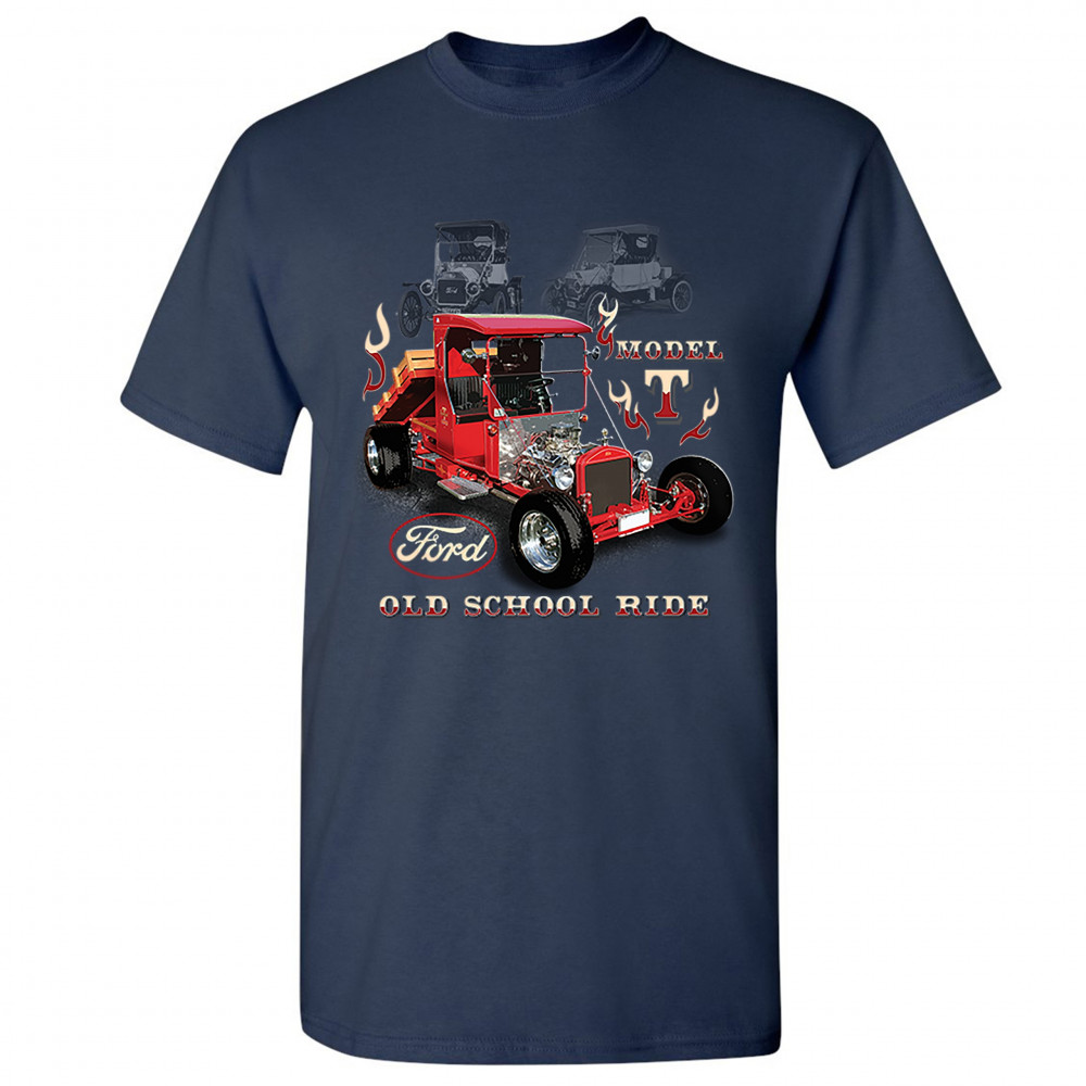 A print featuring a Ford Model T modified as a hot rod. The are also two transparent pictures of original T Models in the background. The print features the Ford logo and says: "Model T, Old School Ride". A great choice for anyone who is a fan of old sch
