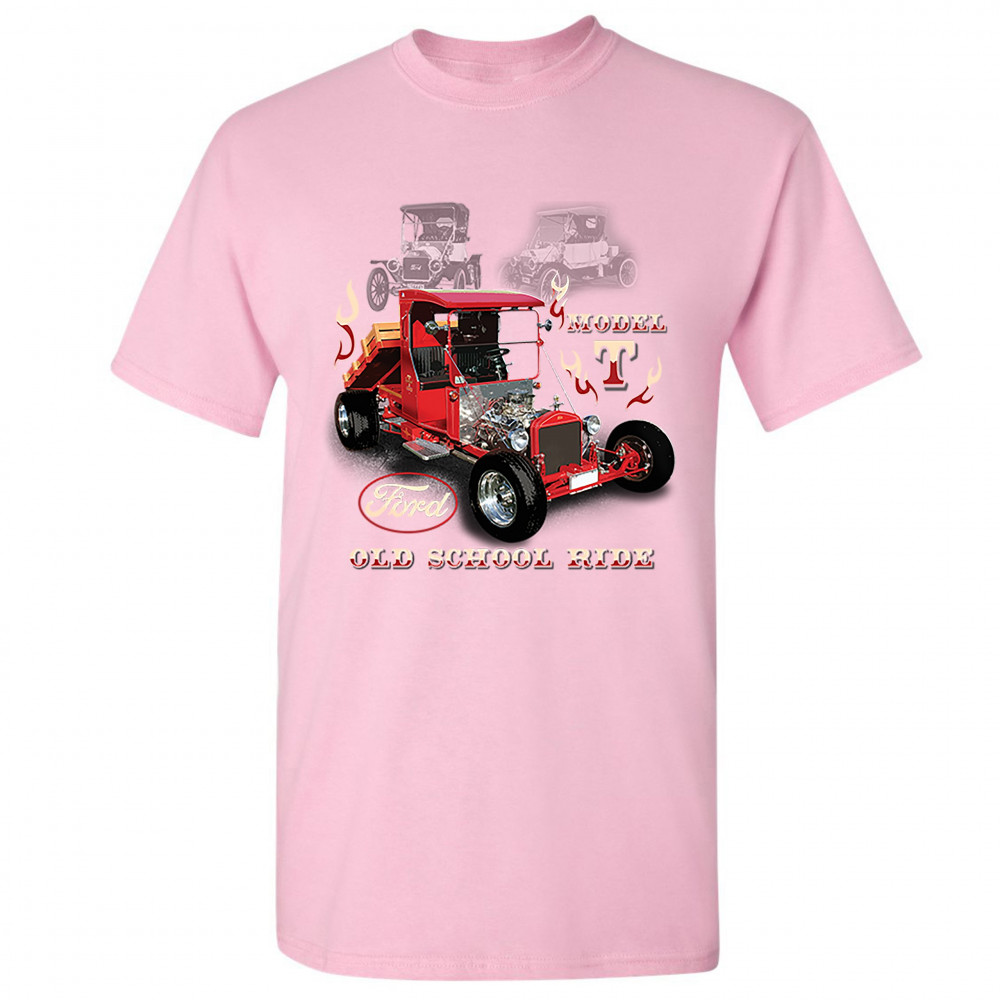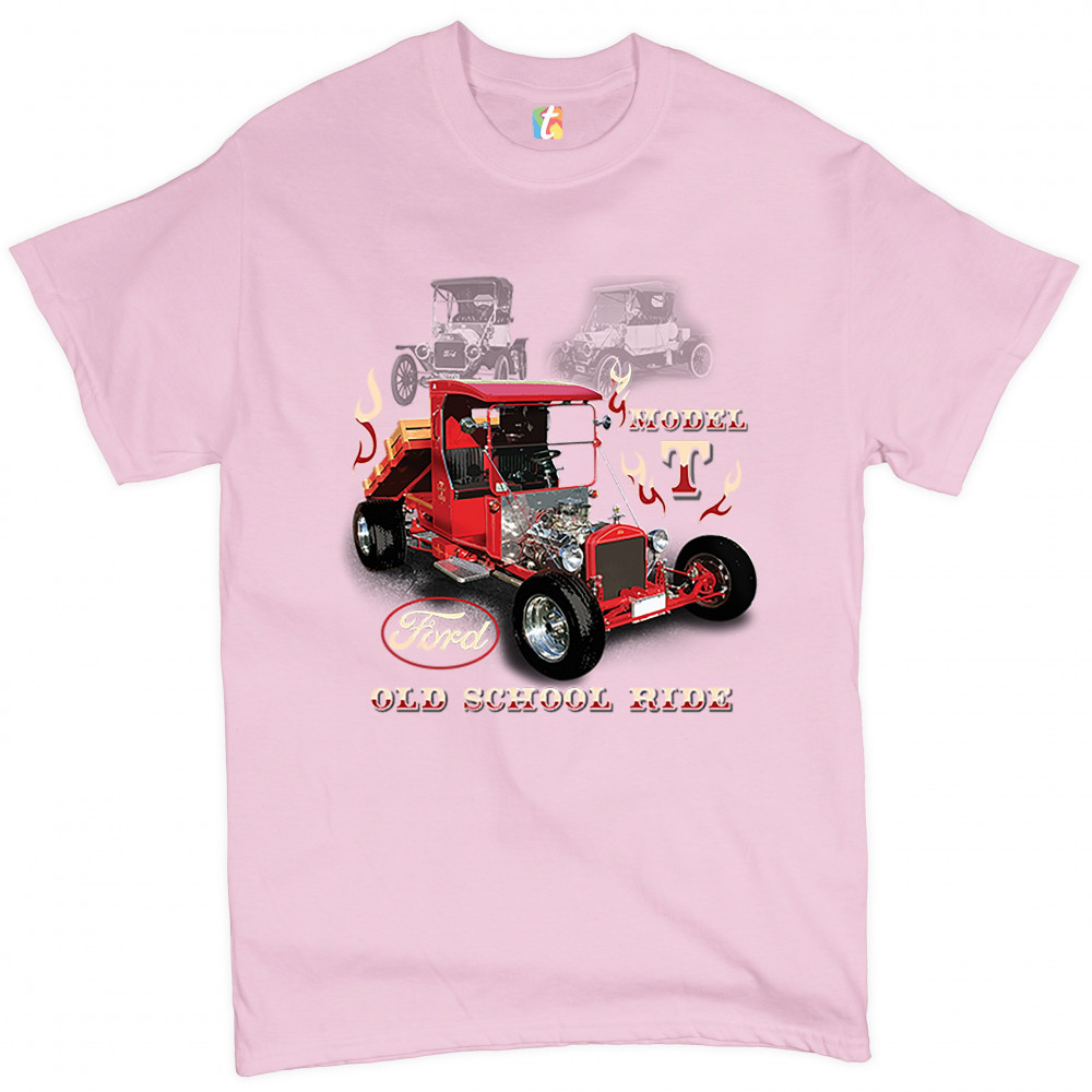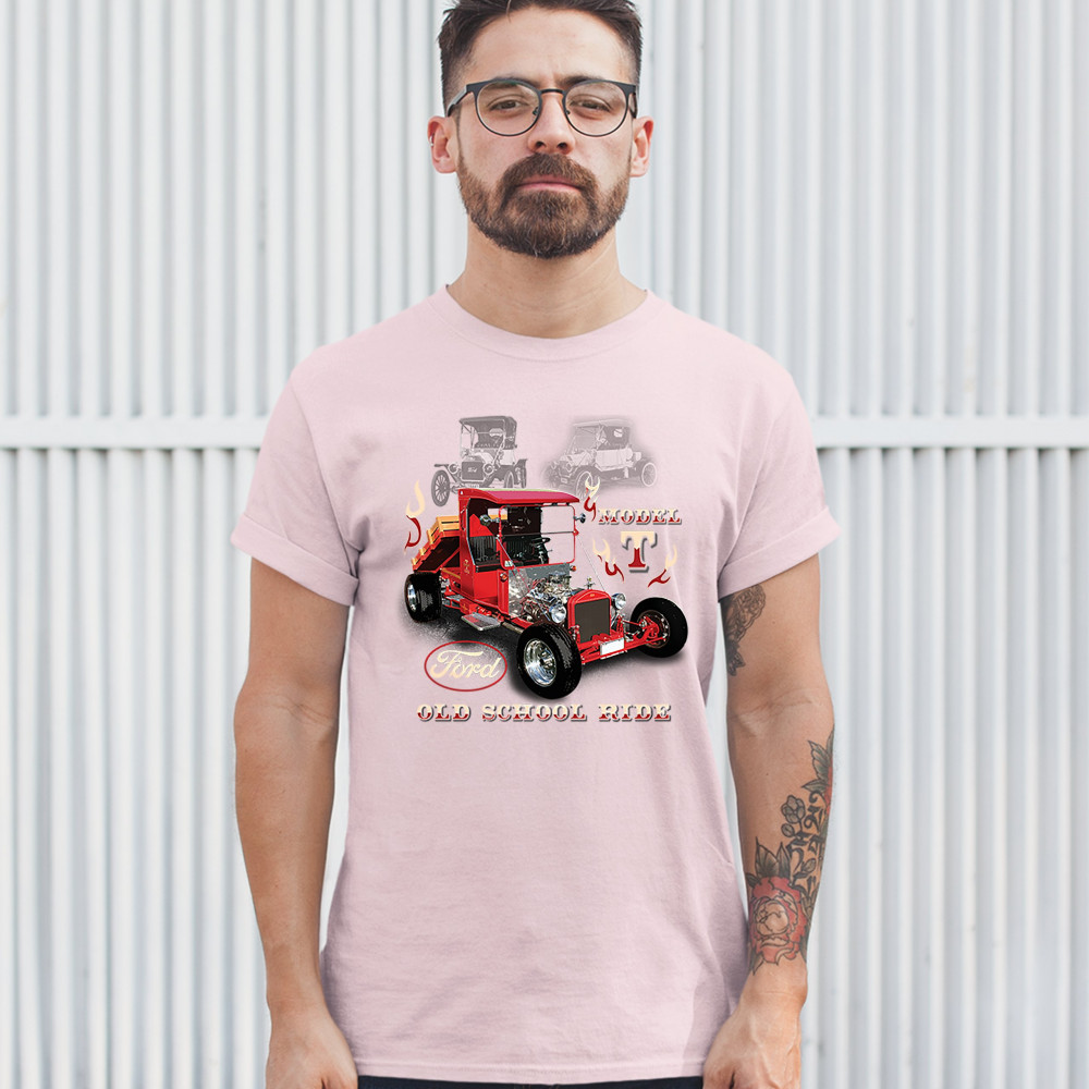 A print featuring a Ford Model T modified as a hot rod. The are also two transparent pictures of original T Models in the background. The print features the Ford logo and says: "Model T, Old School Ride". A great choice for anyone who is a fan of old sch