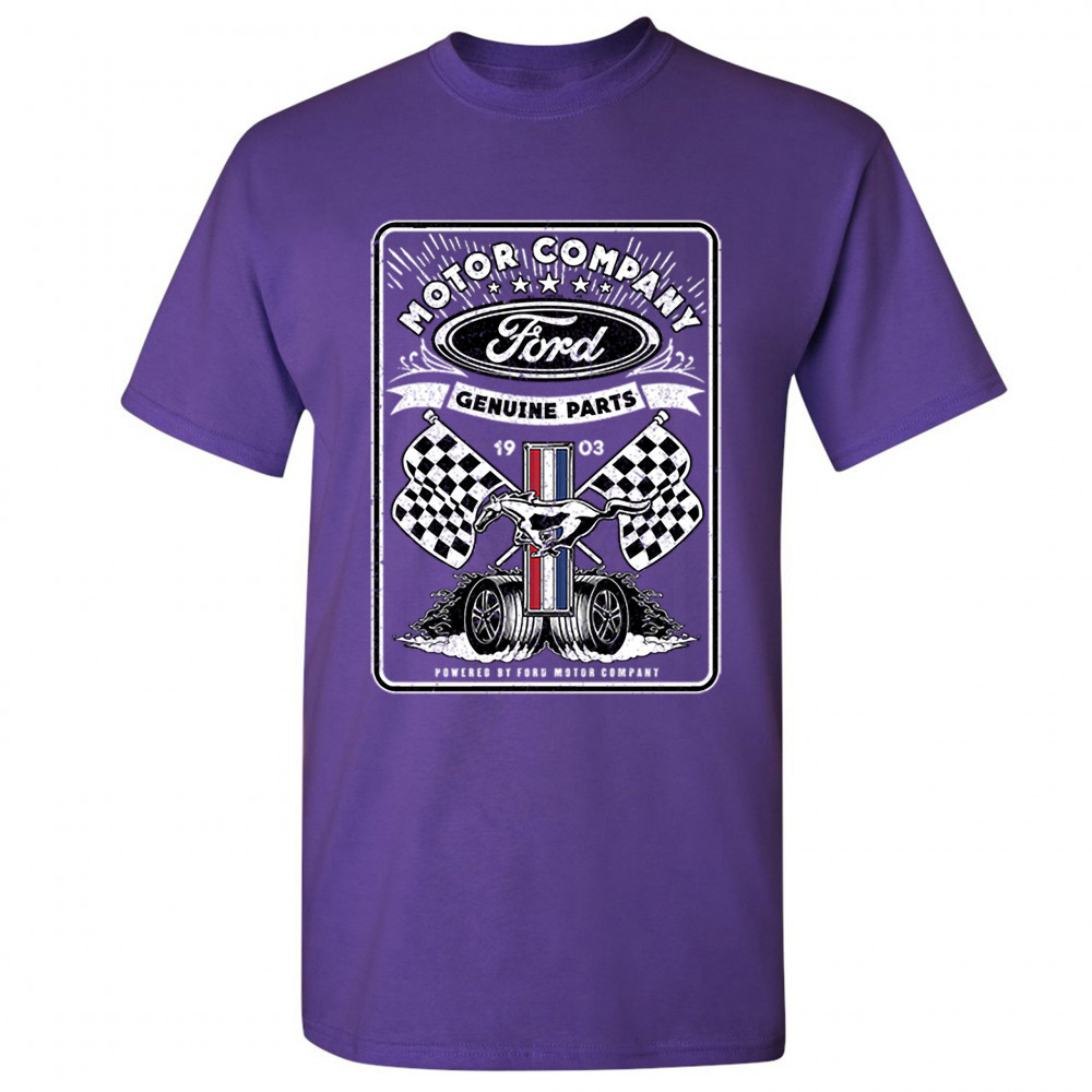A print featuring Ford logo in the top, Mustang logo in the center, two racing flags and two rolling wheels. The prints says: "Ford Motor Company Genuine Parts 1903" in the top and "Powered by Ford Motor Company" in the bottom. A great choice for anyone w