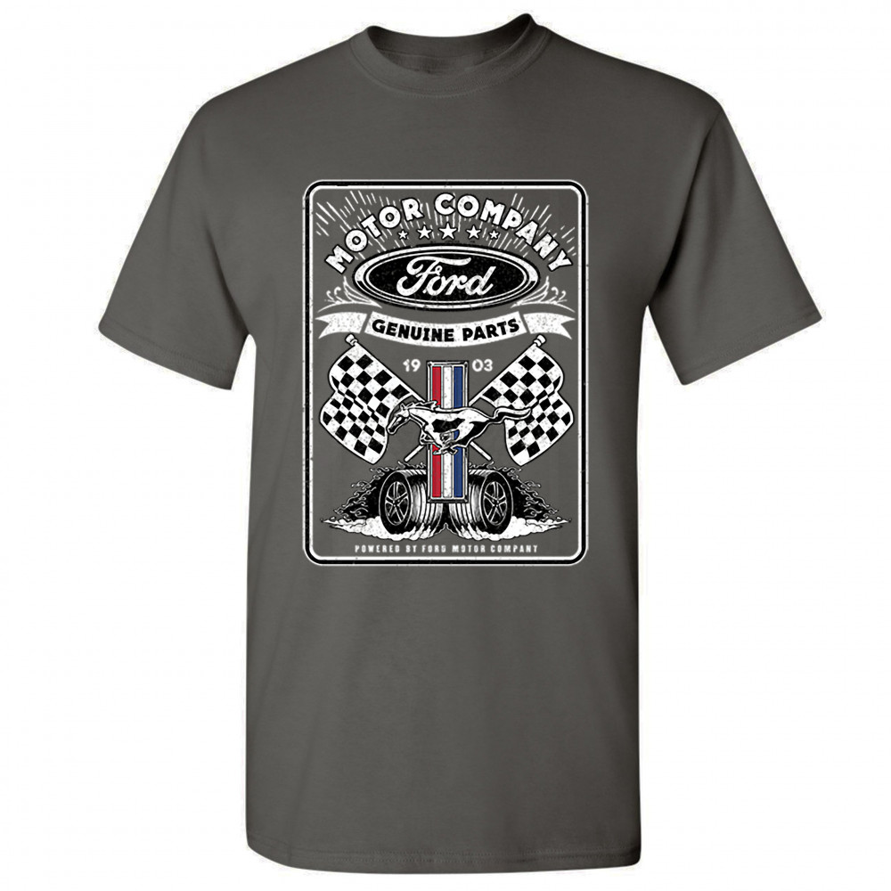 A print featuring Ford logo in the top, Mustang logo in the center, two racing flags and two rolling wheels. The prints says: "Ford Motor Company Genuine Parts 1903" in the top and "Powered by Ford Motor Company" in the bottom. A great choice for anyone w
