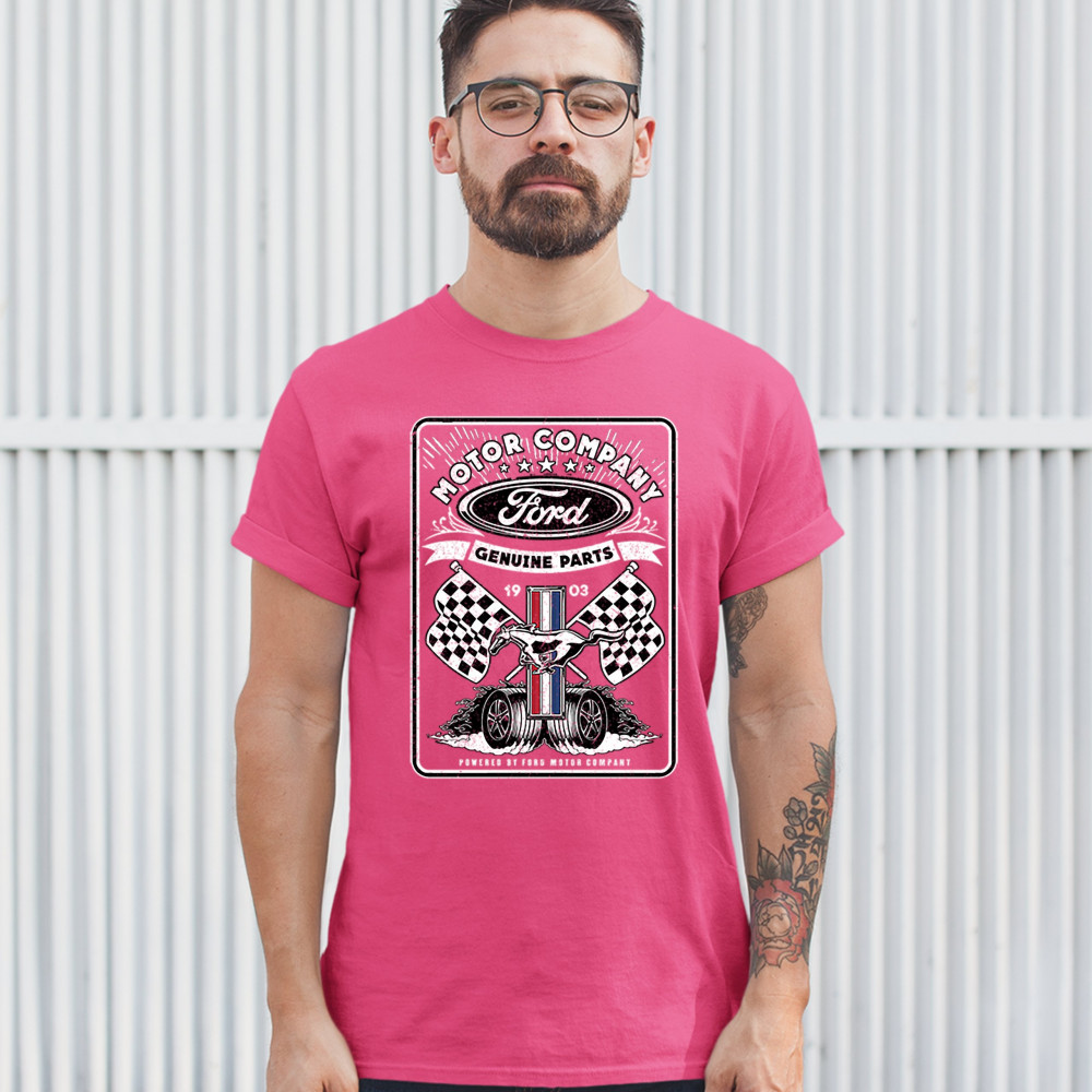 A print featuring Ford logo in the top, Mustang logo in the center, two racing flags and two rolling wheels. The prints says: "Ford Motor Company Genuine Parts 1903" in the top and "Powered by Ford Motor Company" in the bottom. A great choice for anyone w