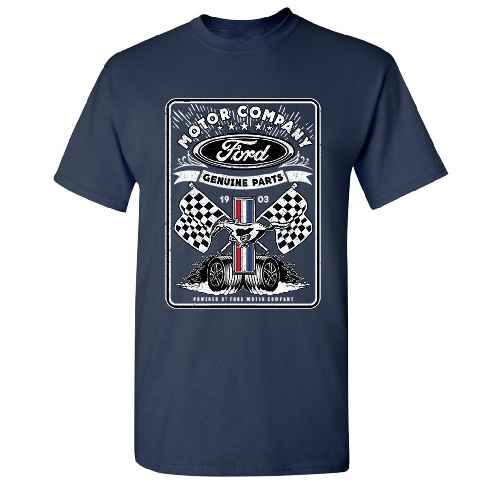 A print featuring Ford logo in the top, Mustang logo in the center, two racing flags and two rolling wheels. The prints says: "Ford Motor Company Genuine Parts 1903" in the top and "Powered by Ford Motor Company" in the bottom. A great choice for anyone w