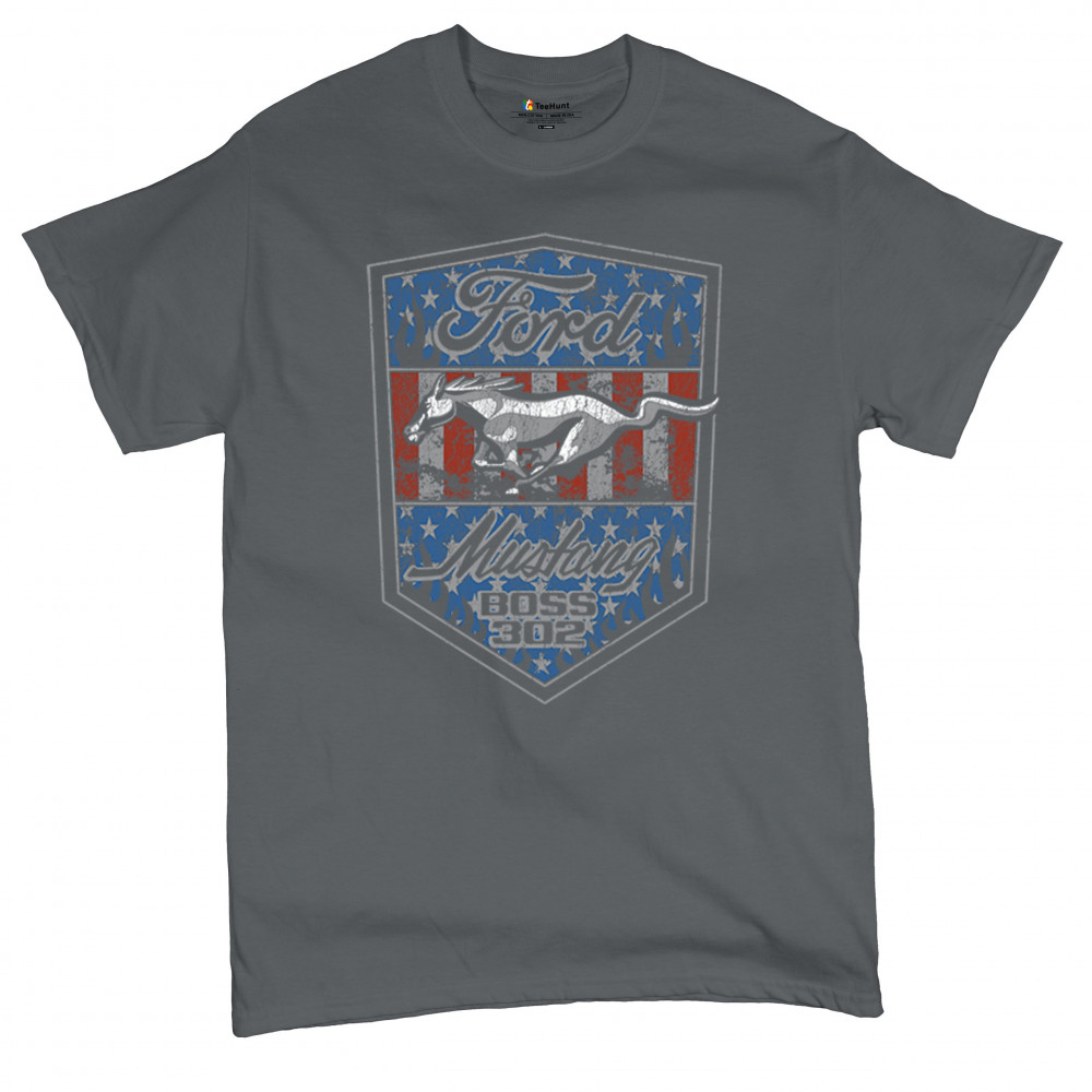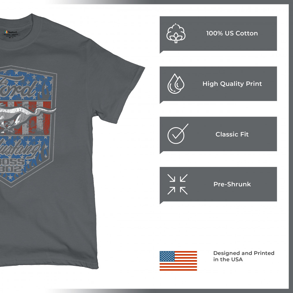 Honor the Ford Mustang Boss 302 legacy with this officially licensed patriotic design, featuring bold flames, the iconic running Mustang, and vintage American muscle style.
