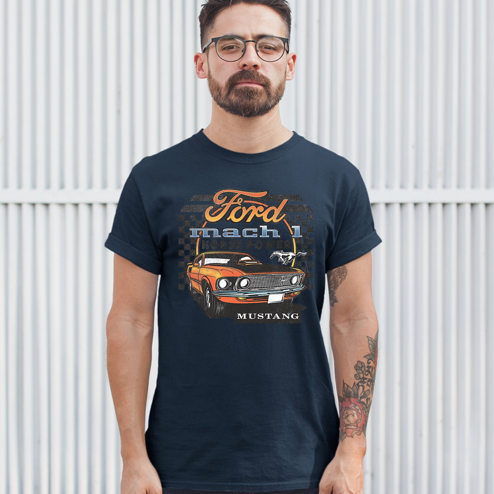 FORD MUSTANG MACH 1 t-shirt horse power american muscle licensed men's tee navy blue