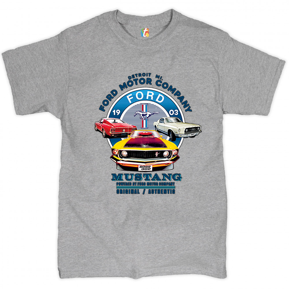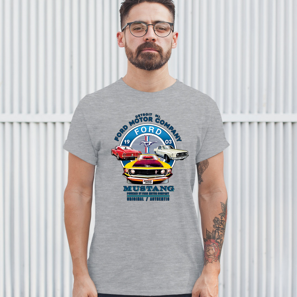 A print featuring three classic Ford Mustangs and their logo in the center. The print says: "Detroit Mi. Ford Motor Company, 1903 Ford Mustang, Powered by Ford Motor Company, Original/Authentic". A great choice for anyone who is a fan of old school Ford M