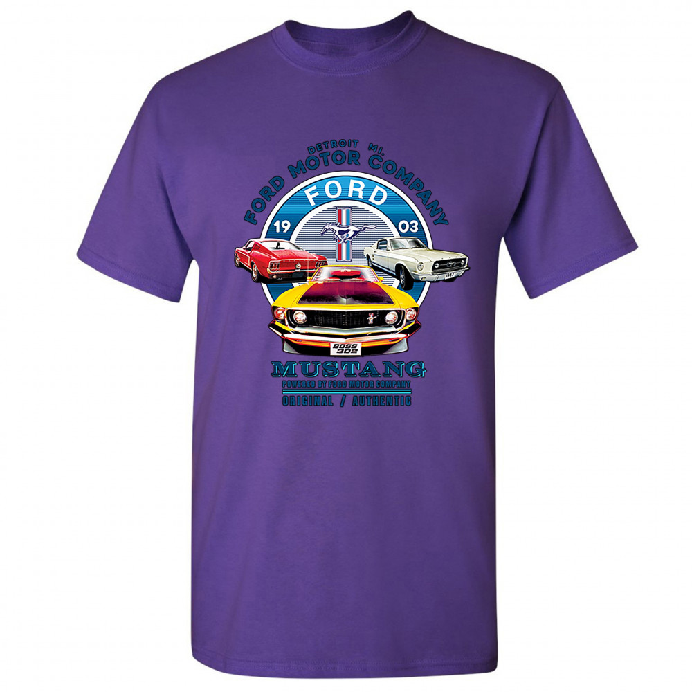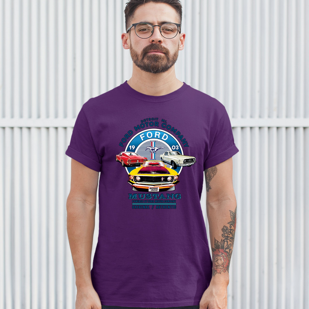 A print featuring three classic Ford Mustangs and their logo in the center. The print says: "Detroit Mi. Ford Motor Company, 1903 Ford Mustang, Powered by Ford Motor Company, Original/Authentic". A great choice for anyone who is a fan of old school Ford M