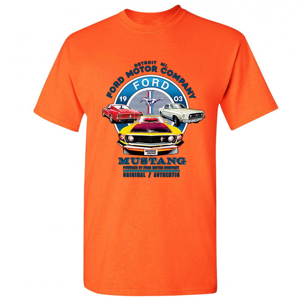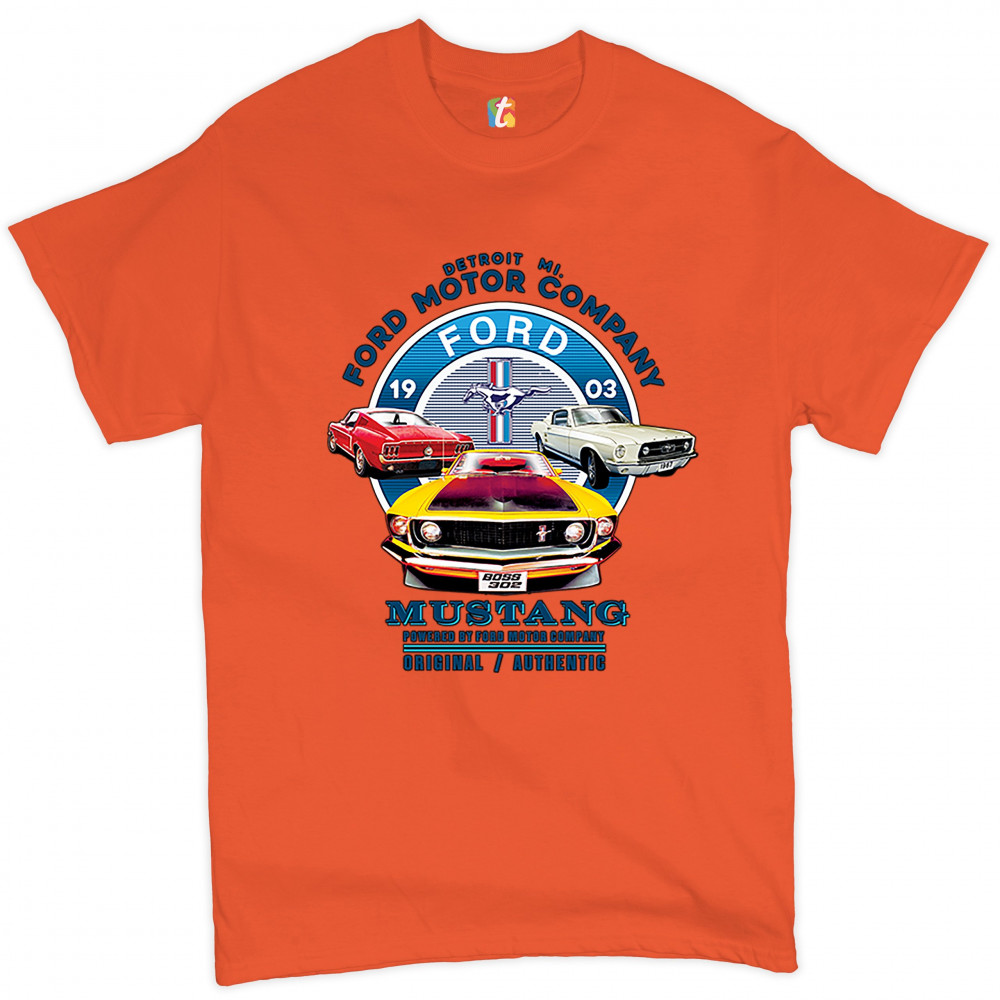A print featuring three classic Ford Mustangs and their logo in the center. The print says: "Detroit Mi. Ford Motor Company, 1903 Ford Mustang, Powered by Ford Motor Company, Original/Authentic". A great choice for anyone who is a fan of old school Ford M