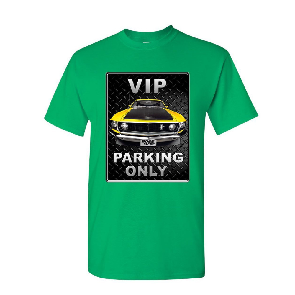 VIP PARKING ONLY ford mustang t-shirt yellow boss 302 muscle car mens tee shirt green