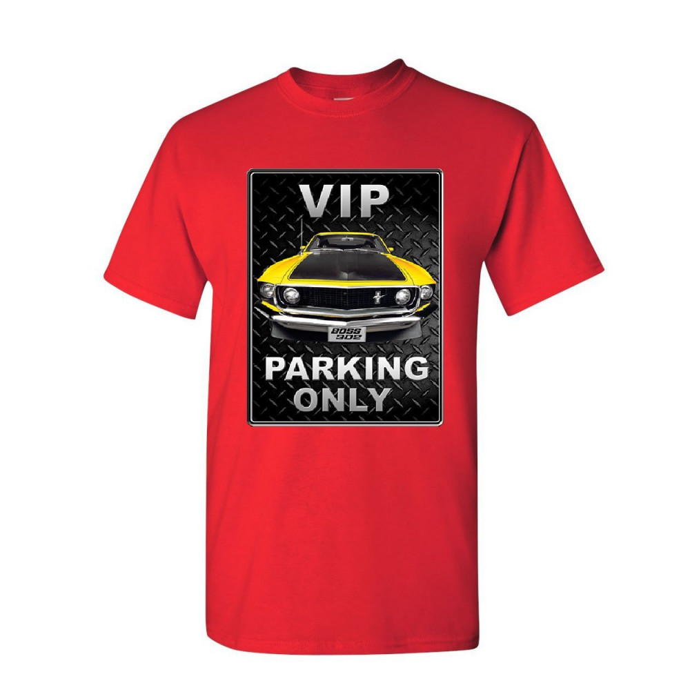 VIP PARKING ONLY ford mustang t-shirt yellow boss 302 muscle car mens tee shirt red