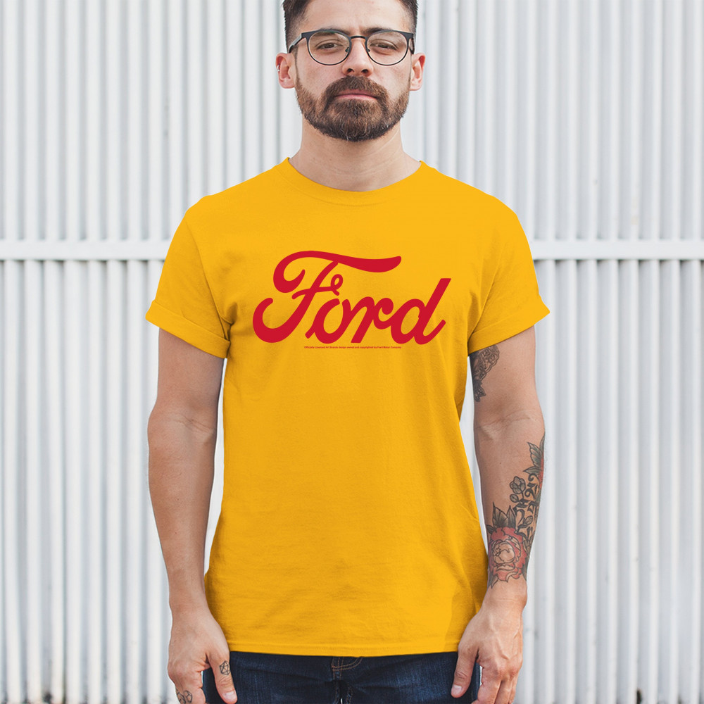 Celebrate American automotive history with this officially licensed Ford script logo design. Rendered in bold red, it honors the legacy of Ford’s muscle car era and modern performance culture. Ideal for collectors, drivers, and auto fans at meets, garages, or everyday wear with pride.