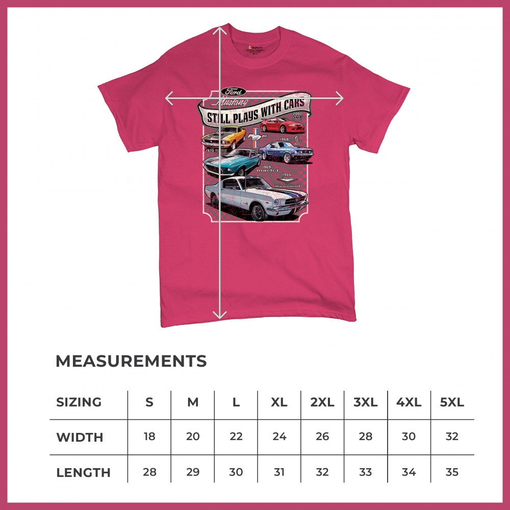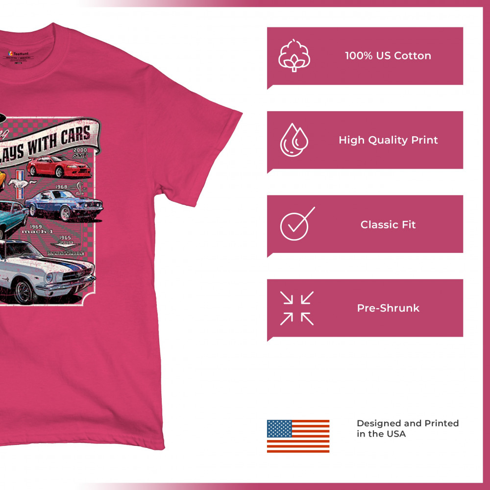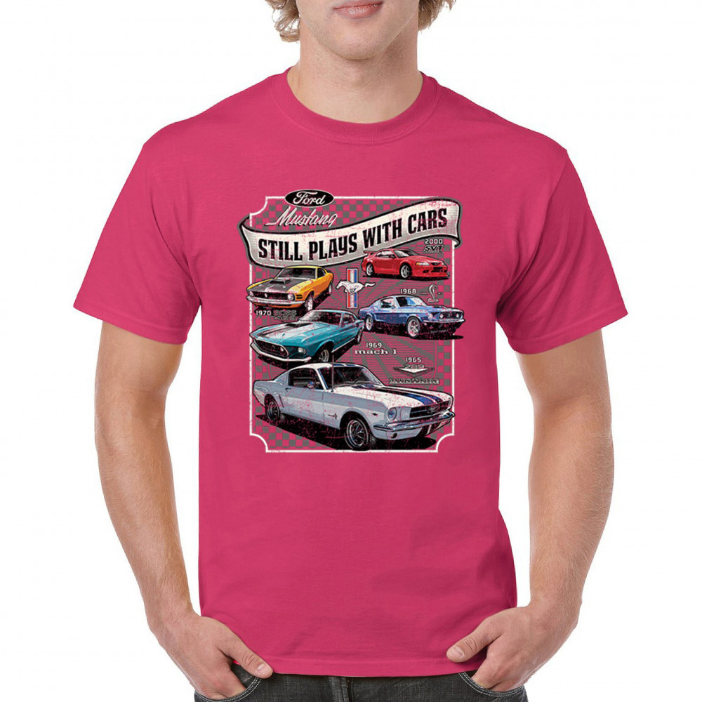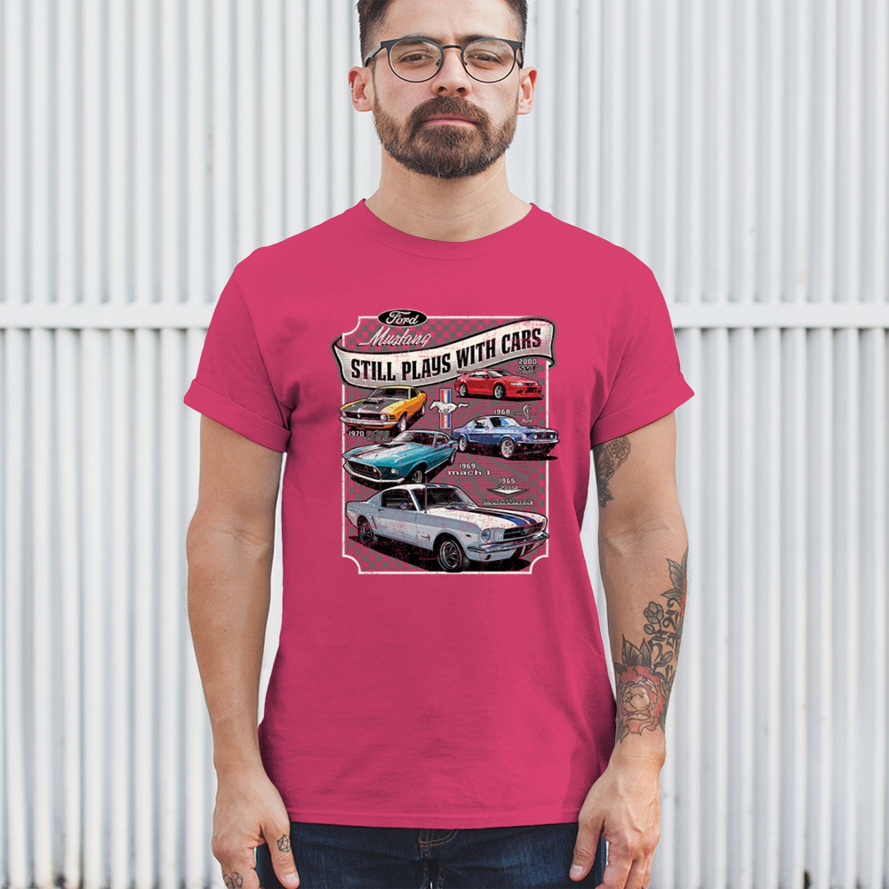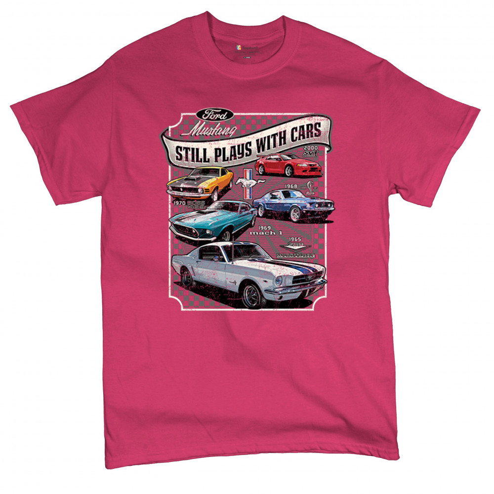 This bold Ford Mustang "Still Plays With Cars" design showcases six classic models from 1965 to 2000, including the 1969 Mach 1, 1970 Boss 302, and 2000 SVT. A dream graphic for muscle car lovers, collectors, and pony car fans. Great for classic auto shows, retro cruises, garage wear, or car clubs.