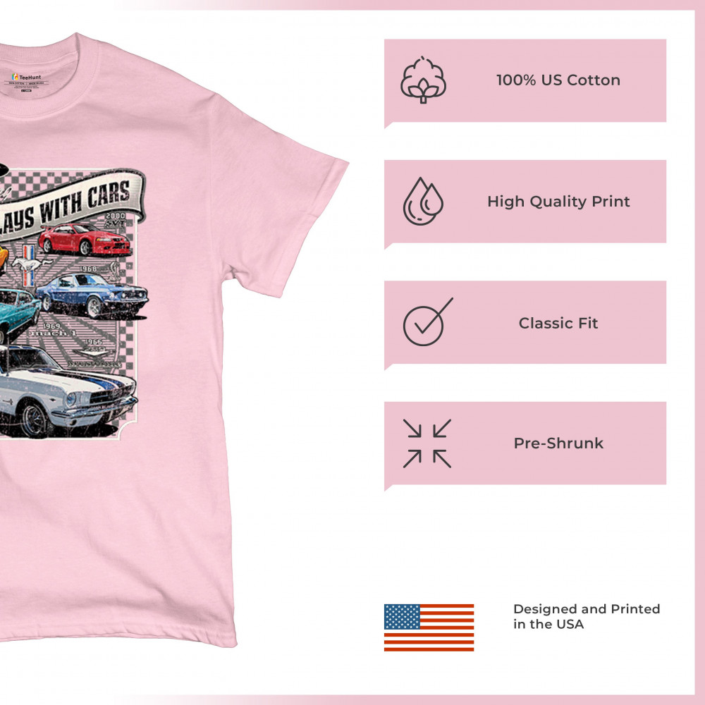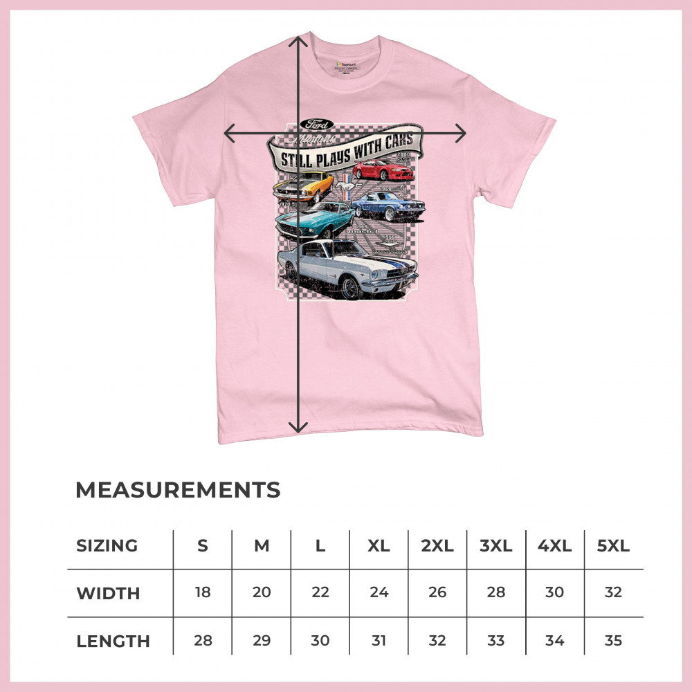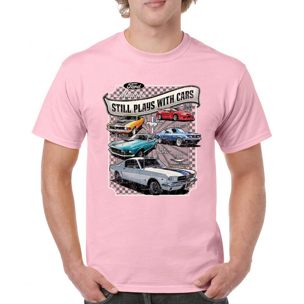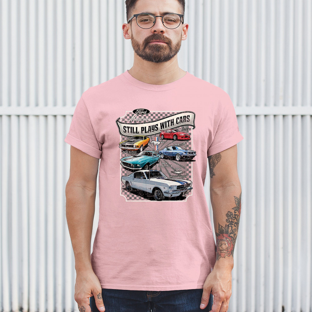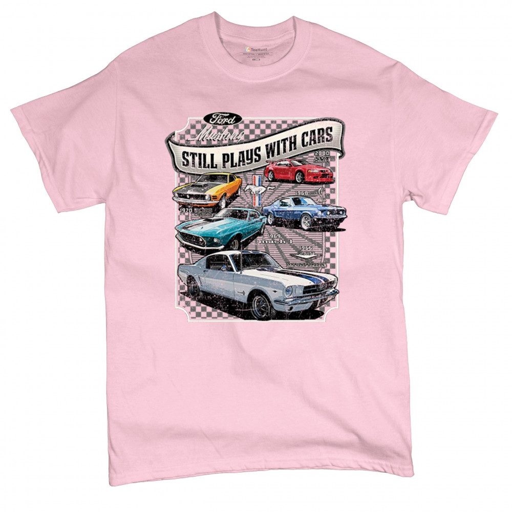 This bold Ford Mustang "Still Plays With Cars" design showcases six classic models from 1965 to 2000, including the 1969 Mach 1, 1970 Boss 302, and 2000 SVT. A dream graphic for muscle car lovers, collectors, and pony car fans. Great for classic auto shows, retro cruises, garage wear, or car clubs.