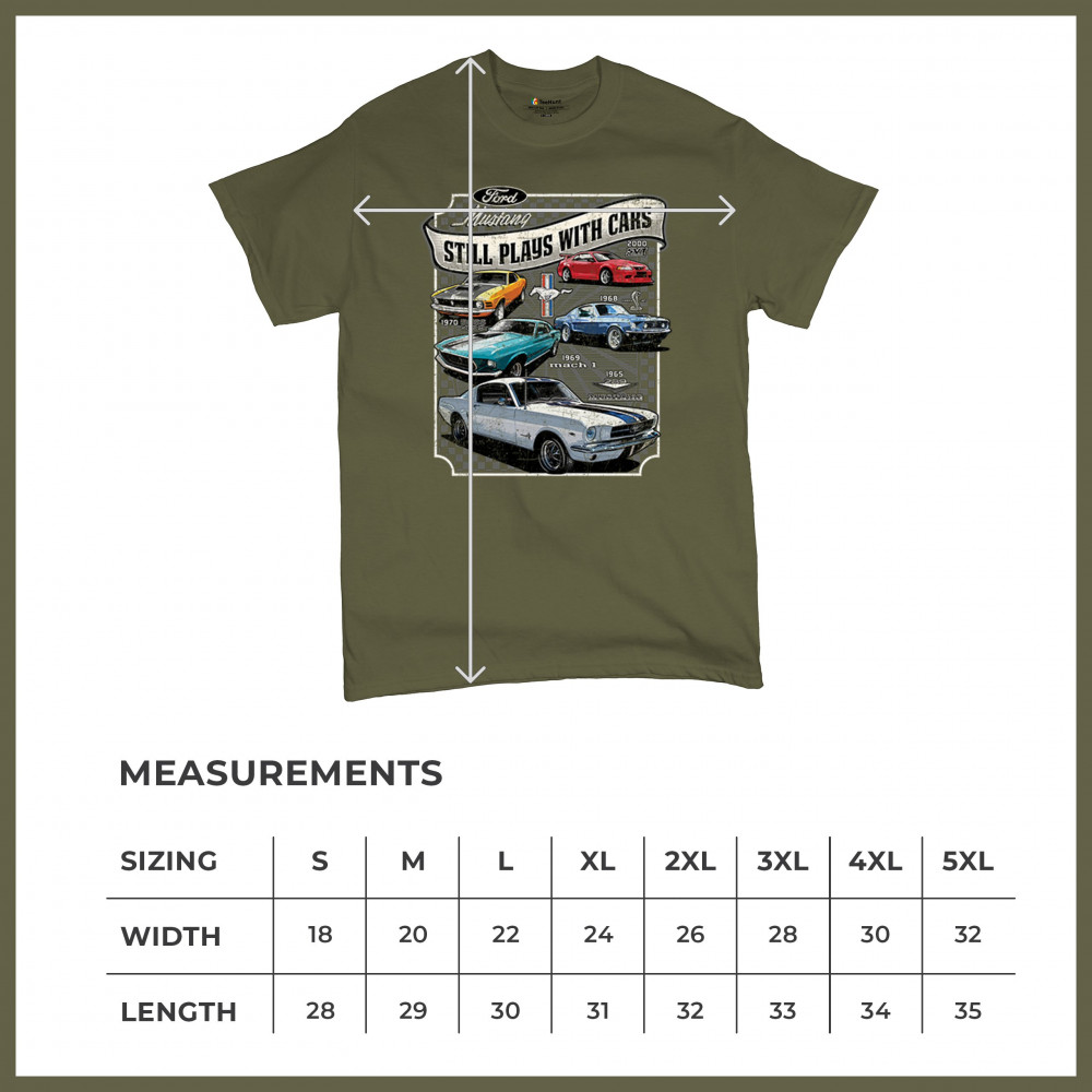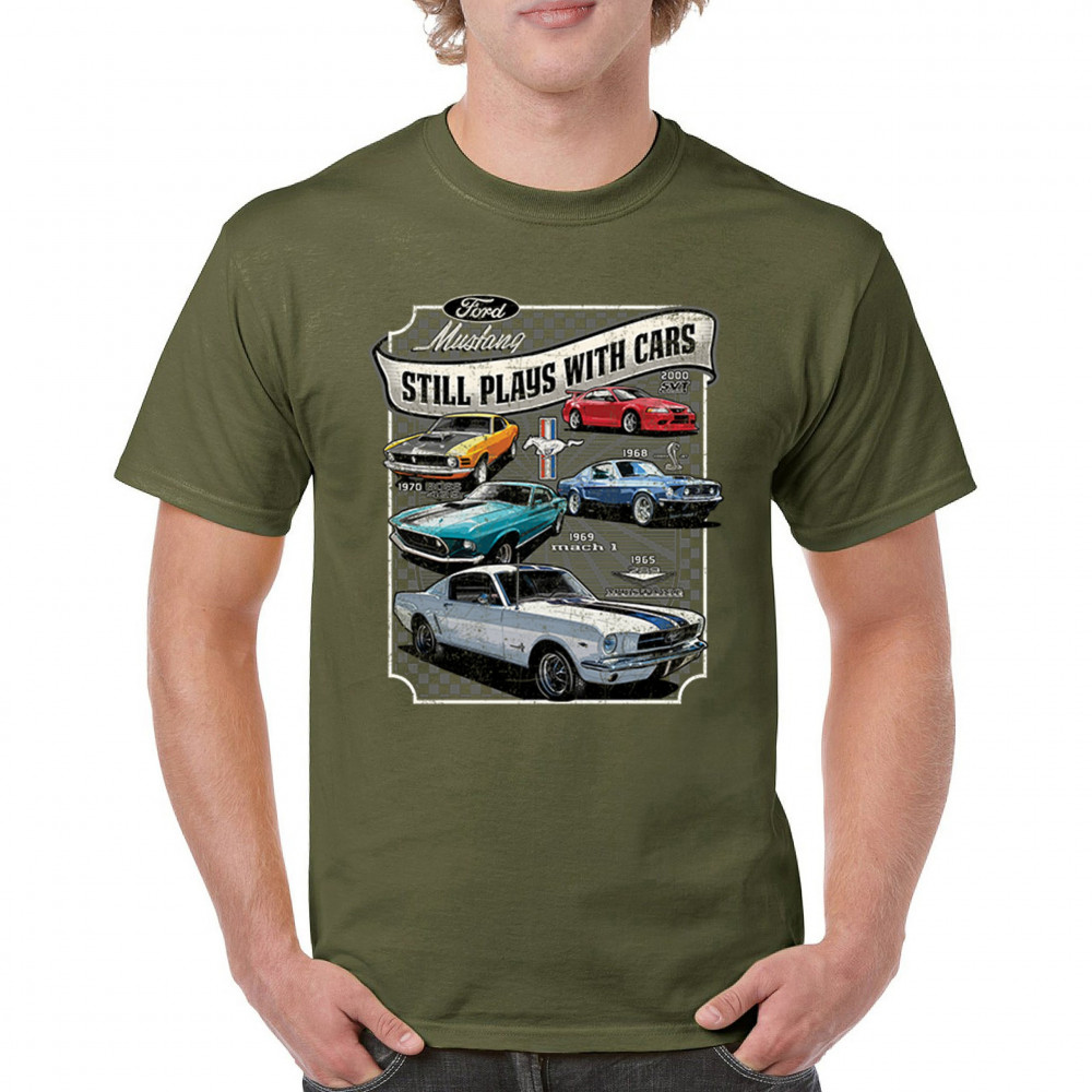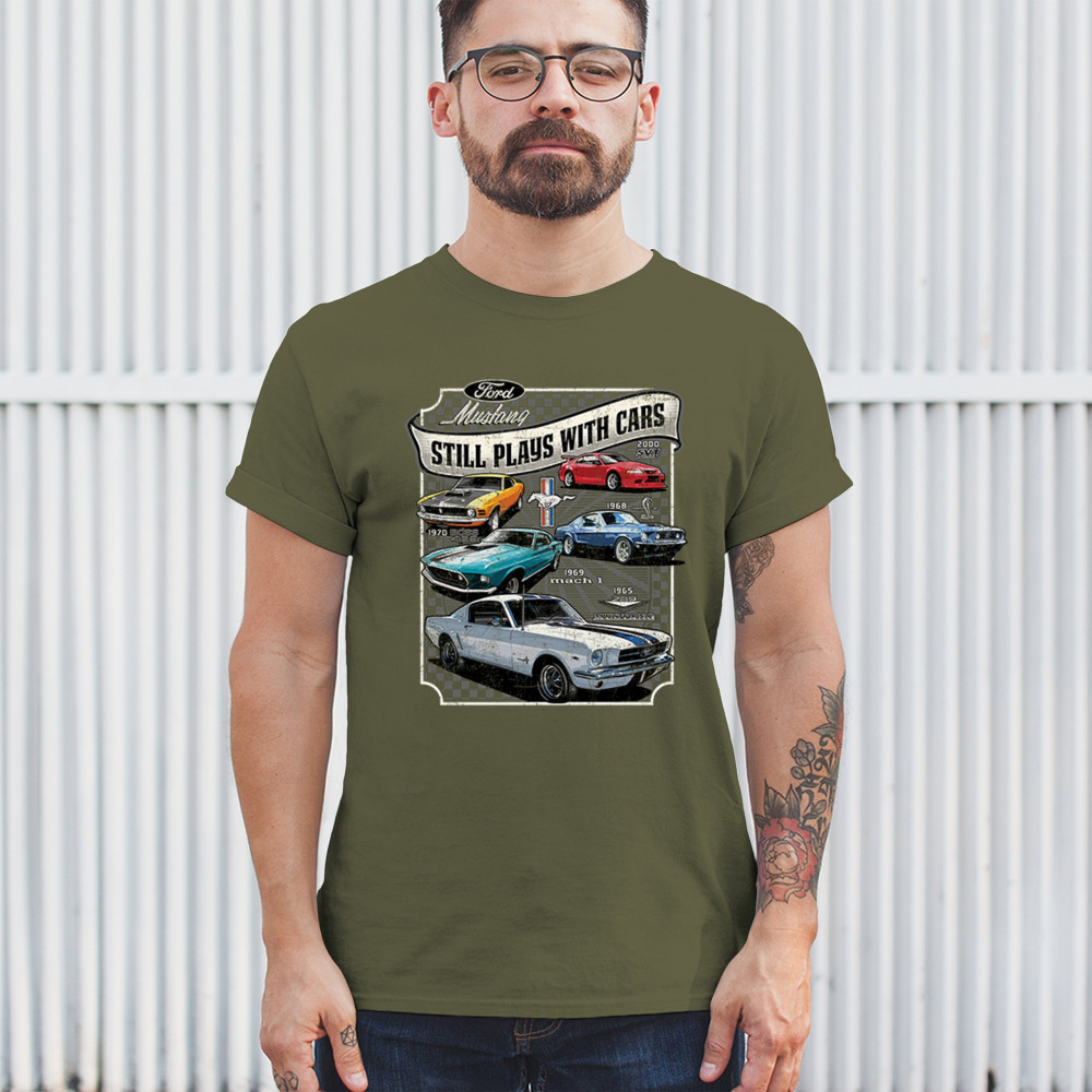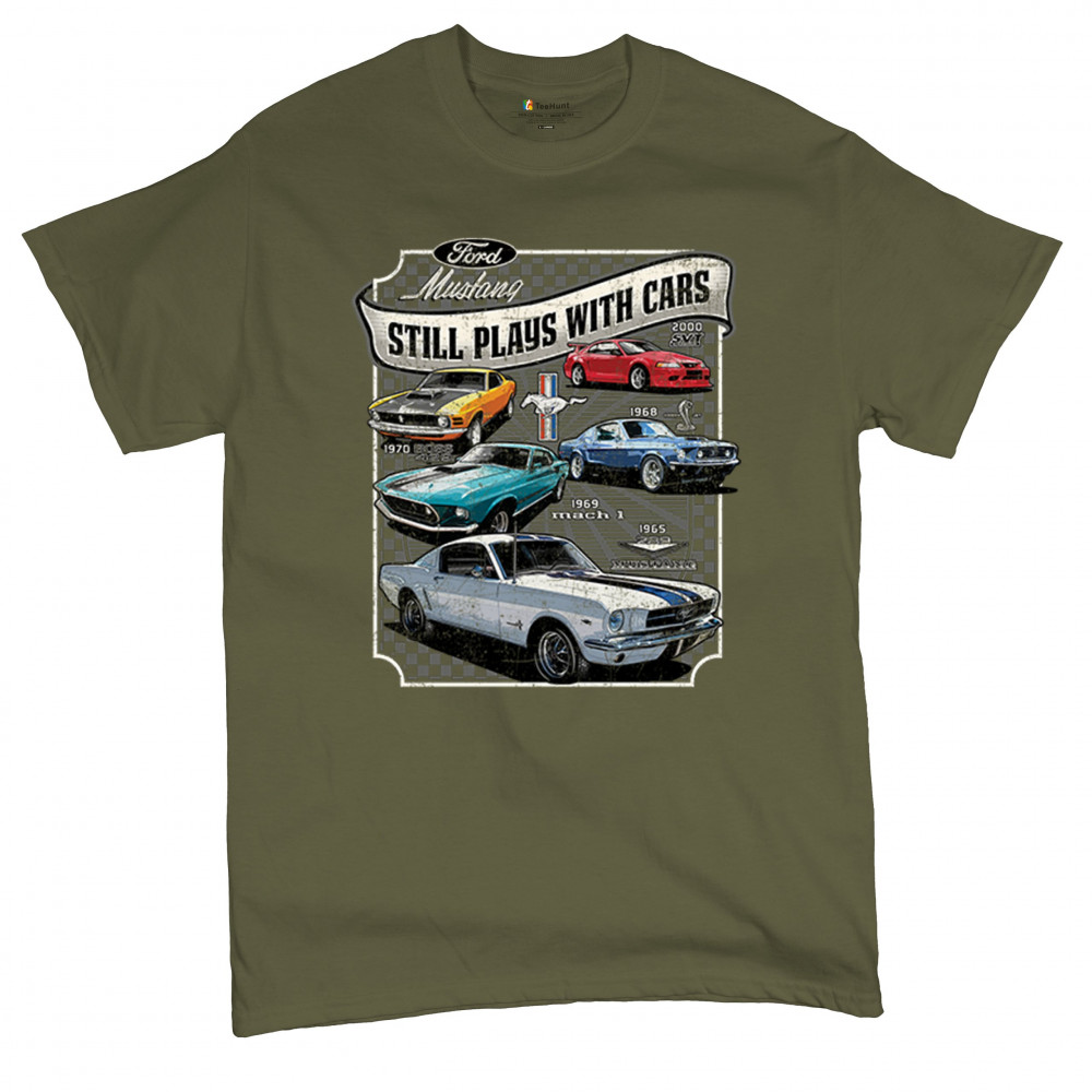 This bold Ford Mustang "Still Plays With Cars" design showcases six classic models from 1965 to 2000, including the 1969 Mach 1, 1970 Boss 302, and 2000 SVT. A dream graphic for muscle car lovers, collectors, and pony car fans. Great for classic auto shows, retro cruises, garage wear, or car clubs.