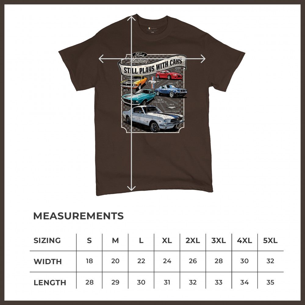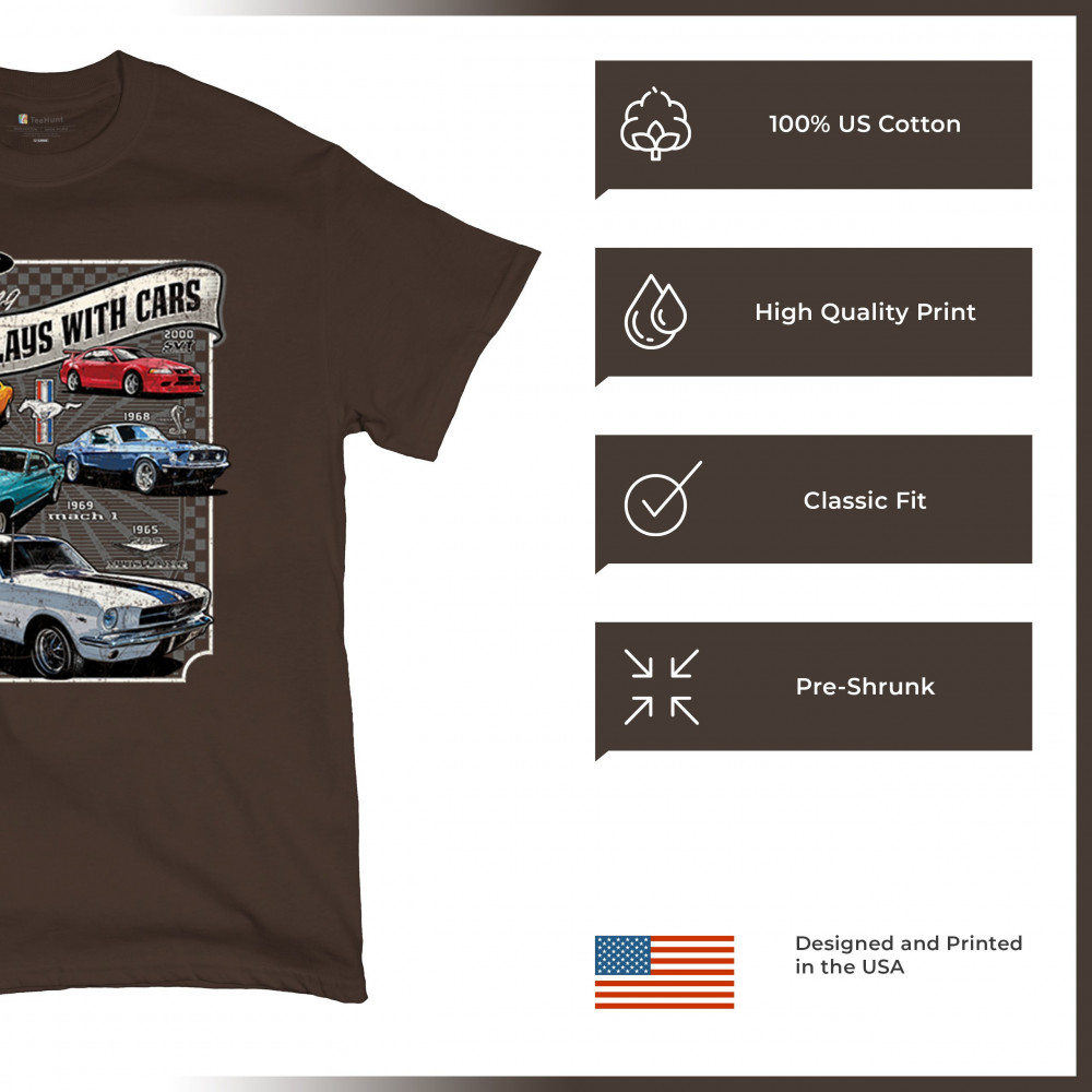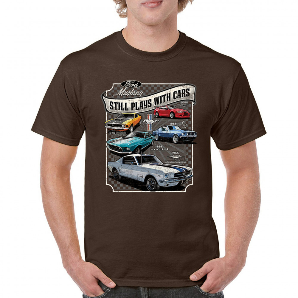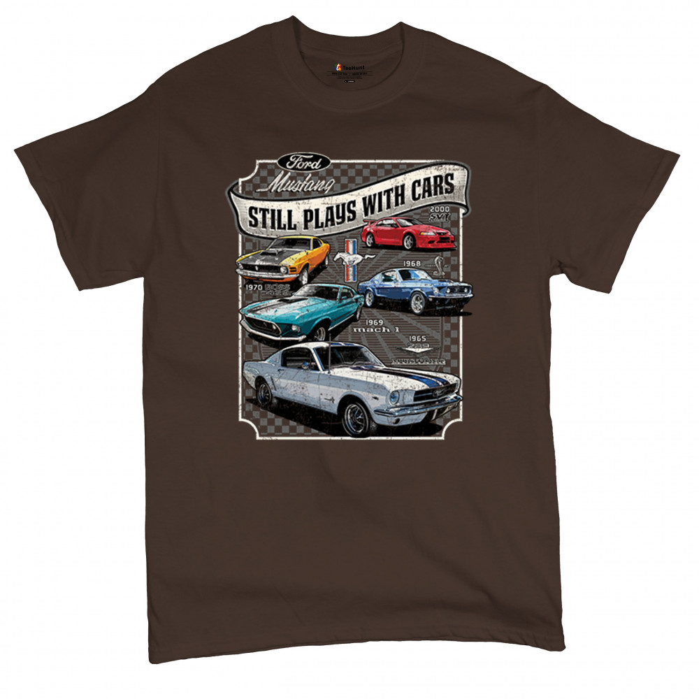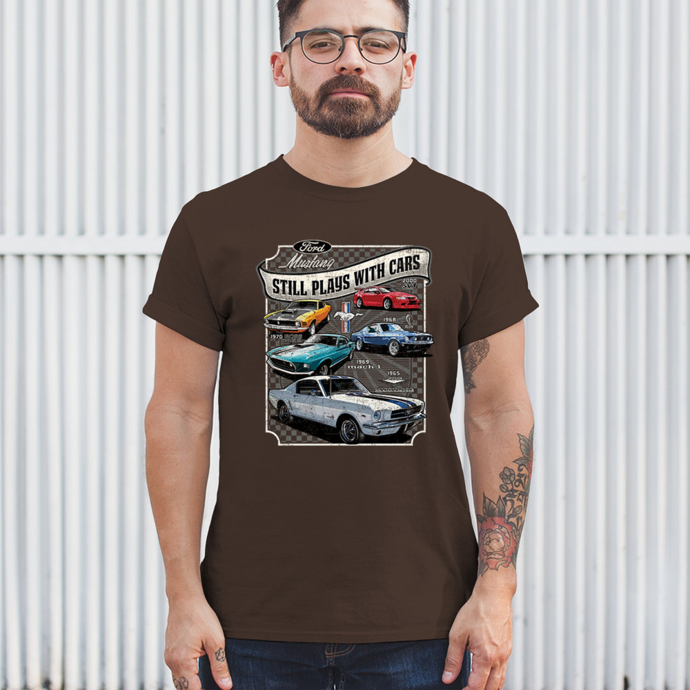 This bold Ford Mustang "Still Plays With Cars" design showcases six classic models from 1965 to 2000, including the 1969 Mach 1, 1970 Boss 302, and 2000 SVT. A dream graphic for muscle car lovers, collectors, and pony car fans. Great for classic auto shows, retro cruises, garage wear, or car clubs.