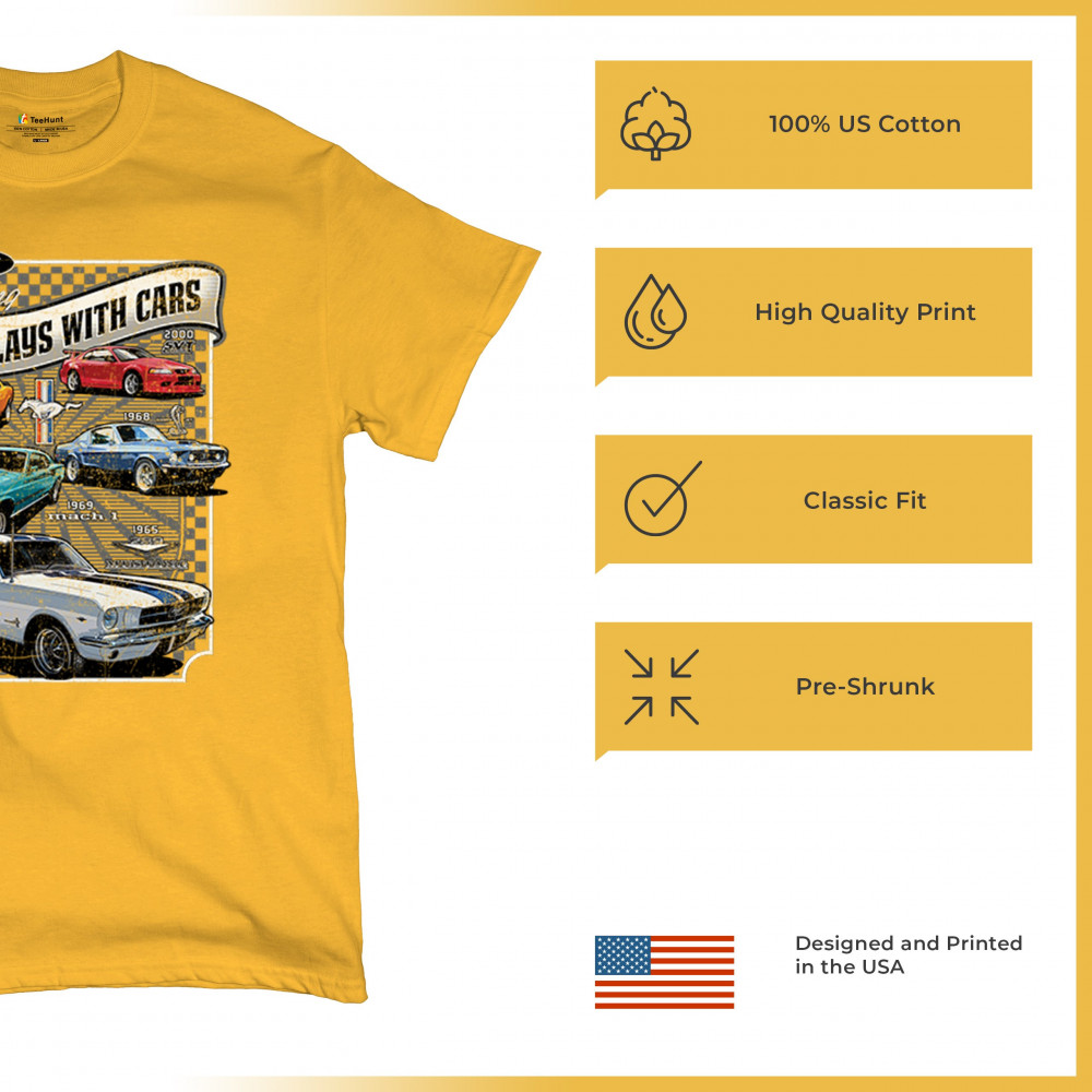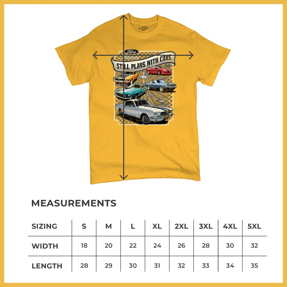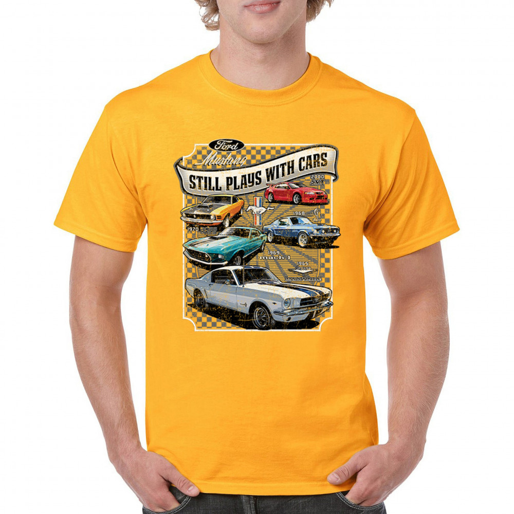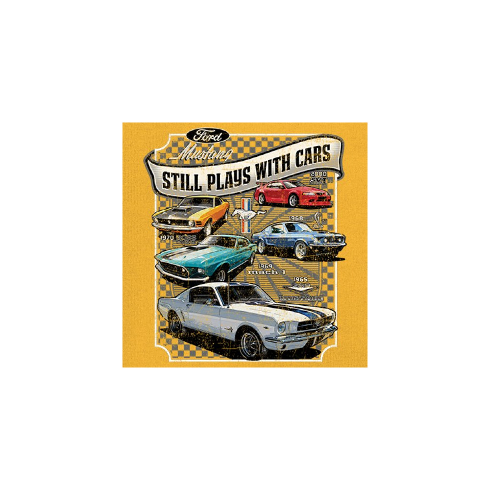 This bold Ford Mustang "Still Plays With Cars" design showcases six classic models from 1965 to 2000, including the 1969 Mach 1, 1970 Boss 302, and 2000 SVT. A dream graphic for muscle car lovers, collectors, and pony car fans. Great for classic auto shows, retro cruises, garage wear, or car clubs.
