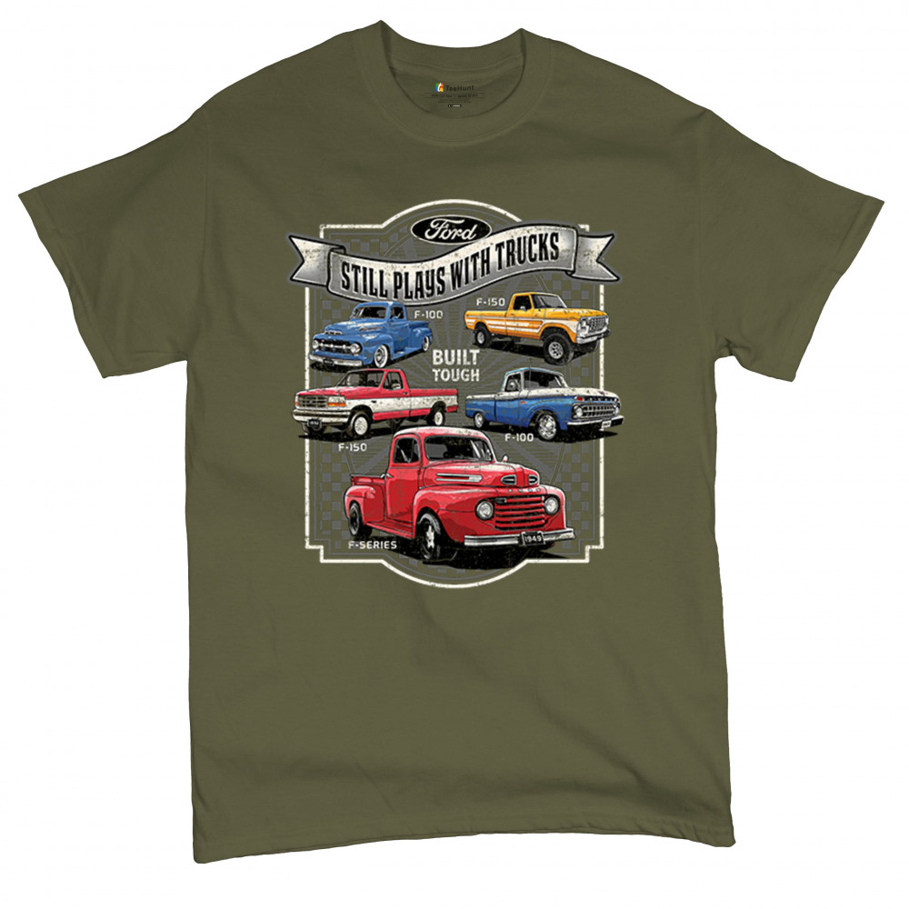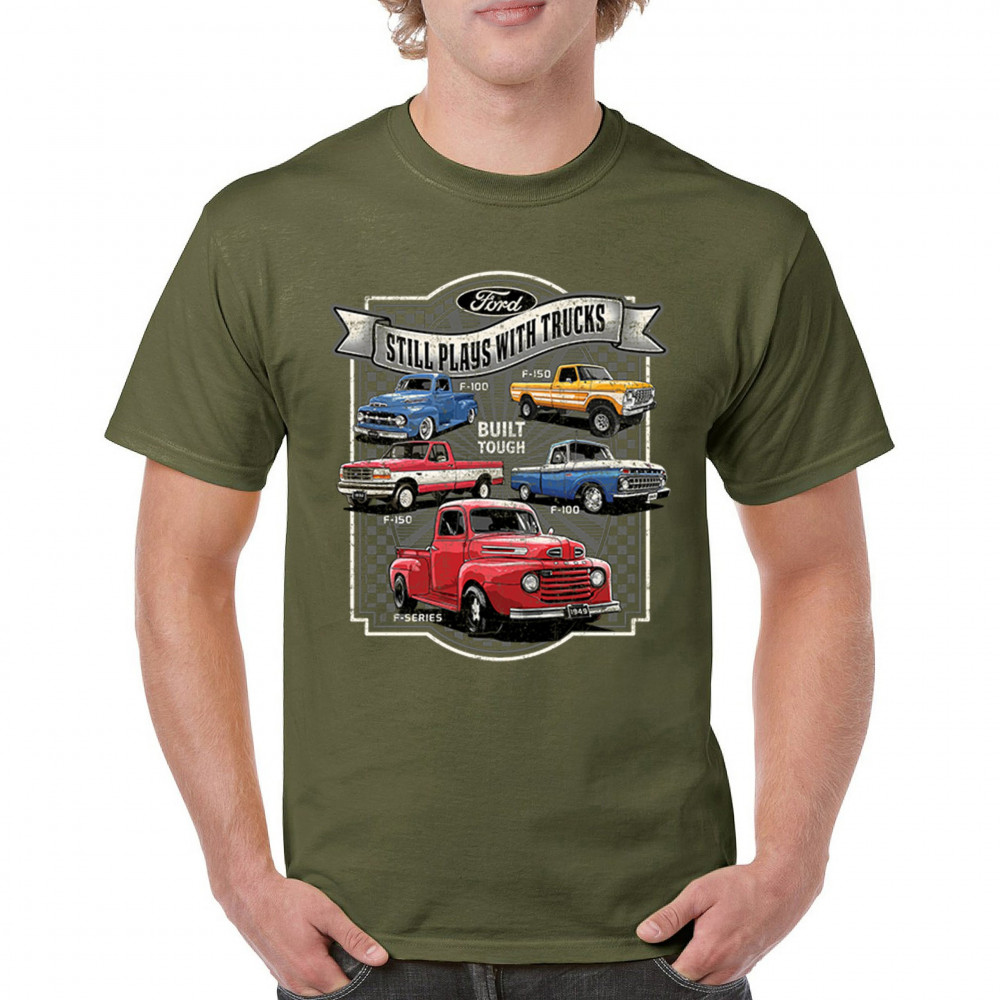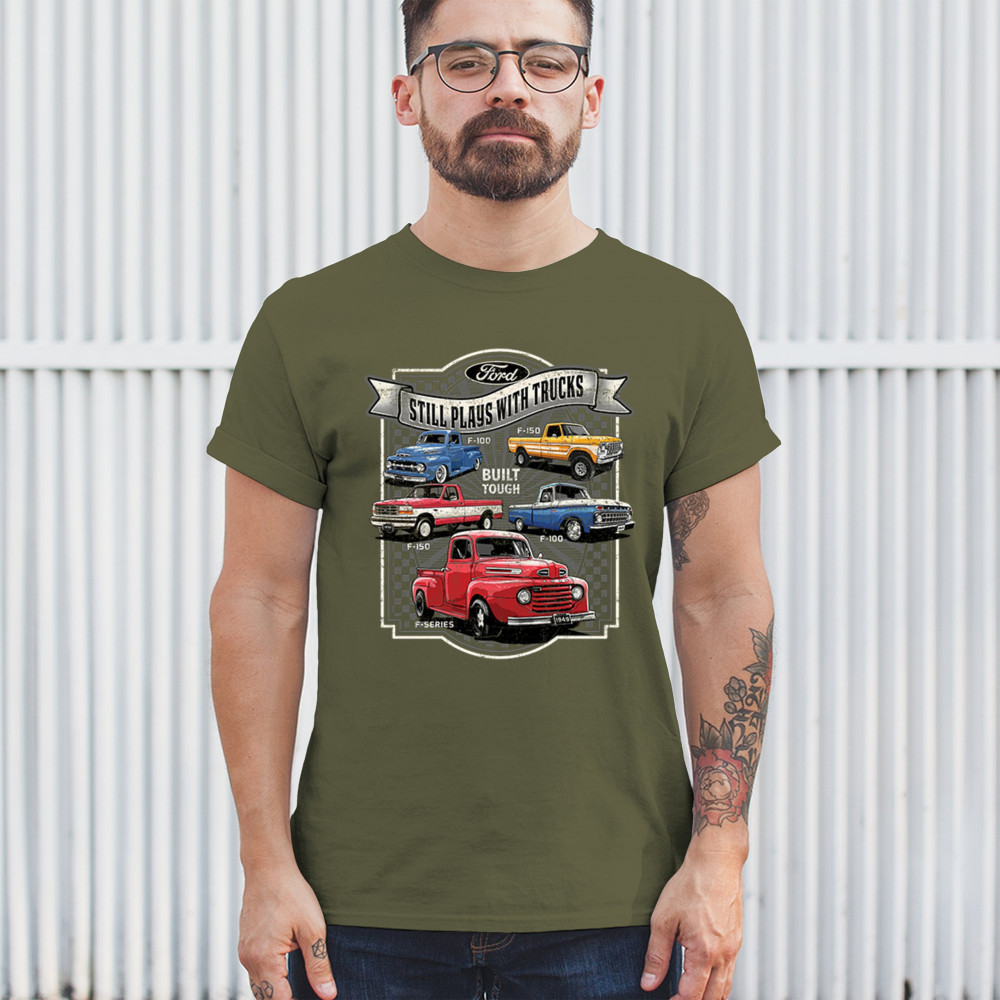 Features classic Ford F-Series trucks from 1949 to F-150. Great for vintage truck fans, garage wear, car shows, and collectors who love pickups.