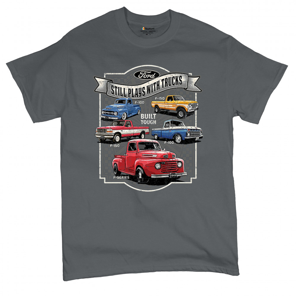 Features classic Ford F-Series trucks from 1949 to F-150. Great for vintage truck fans, garage wear, car shows, and collectors who love pickups.