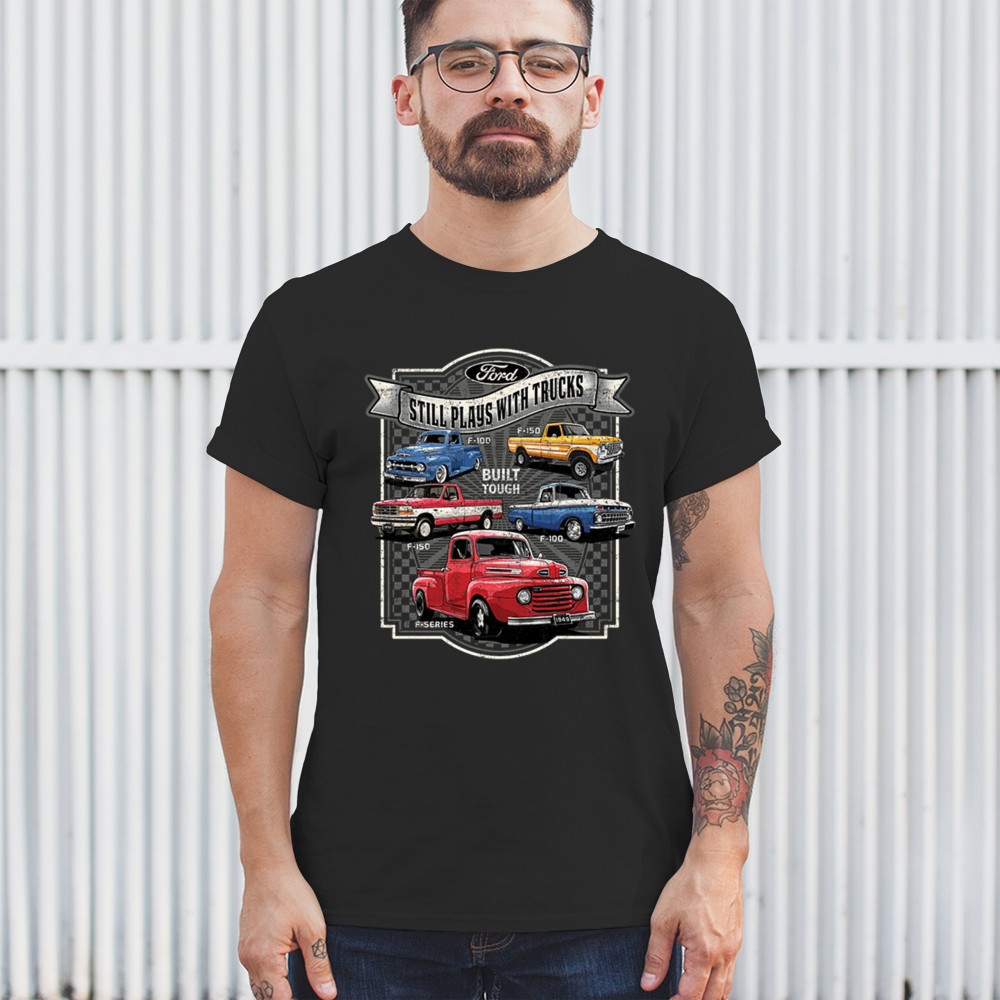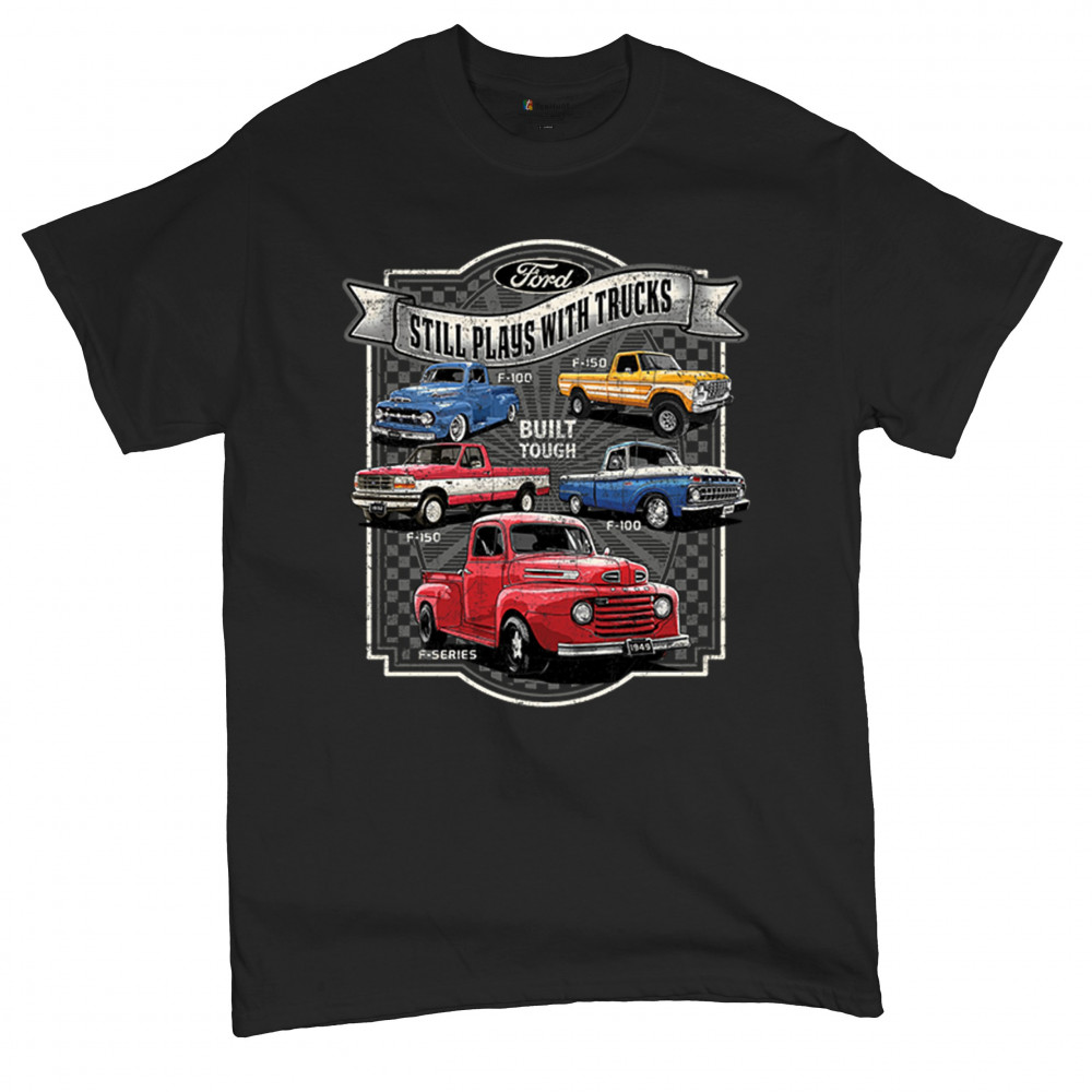 FORD STILL PLAYS WITH TRUCKS t-shirt f100 f150 pickup built tough men's tee black