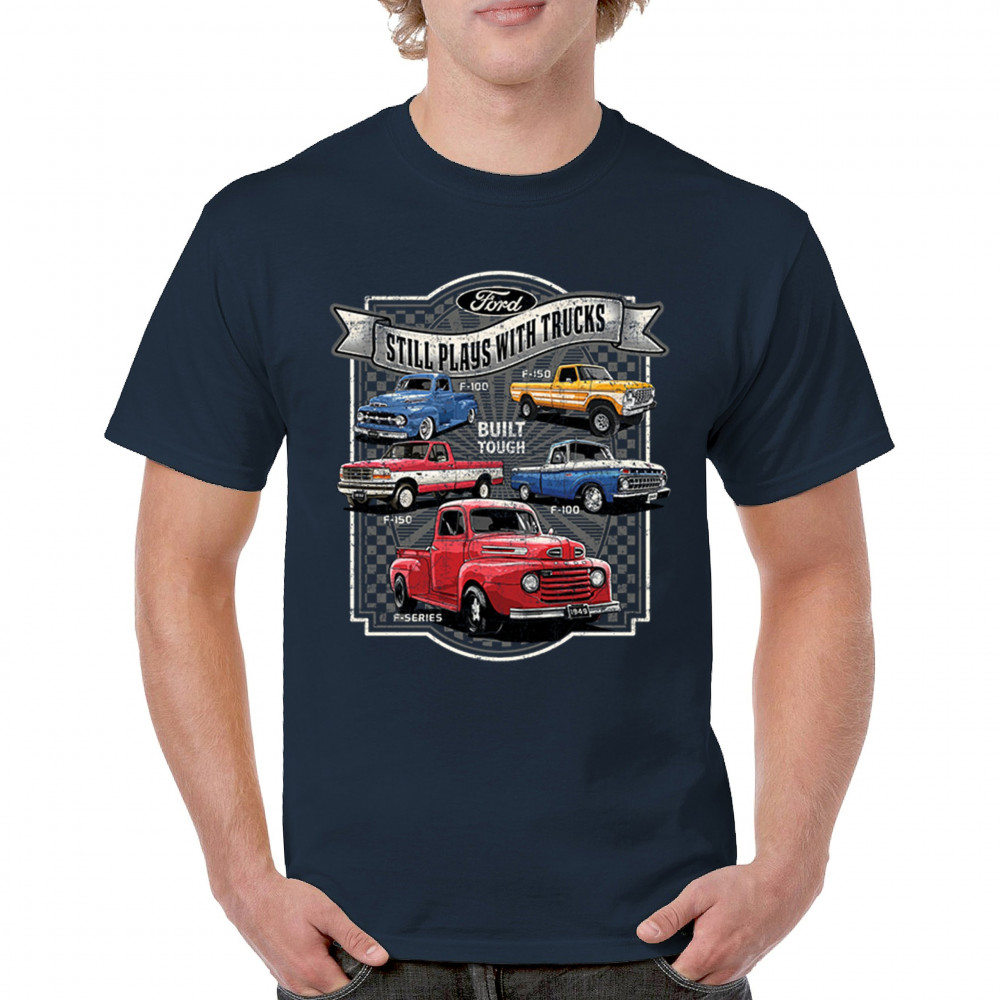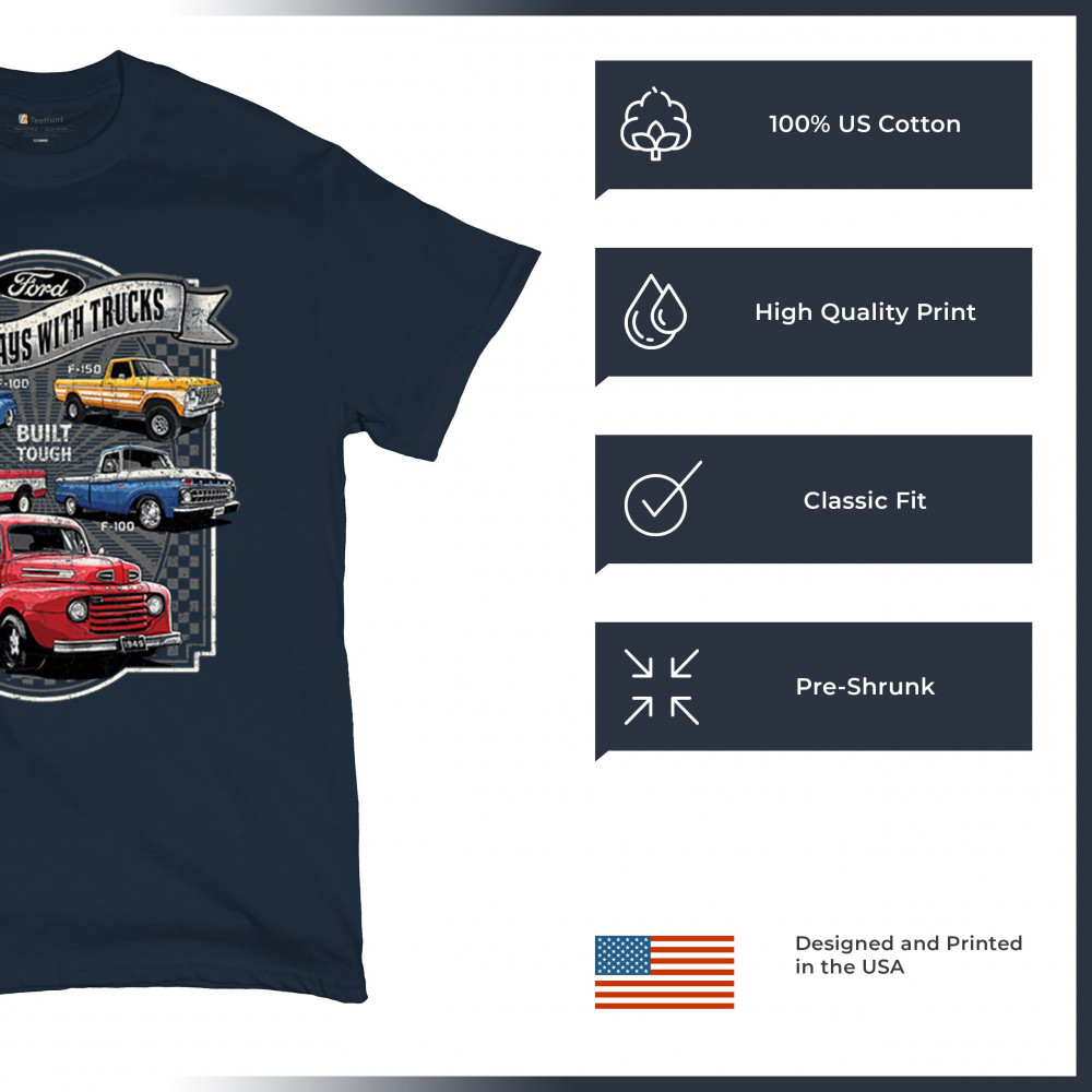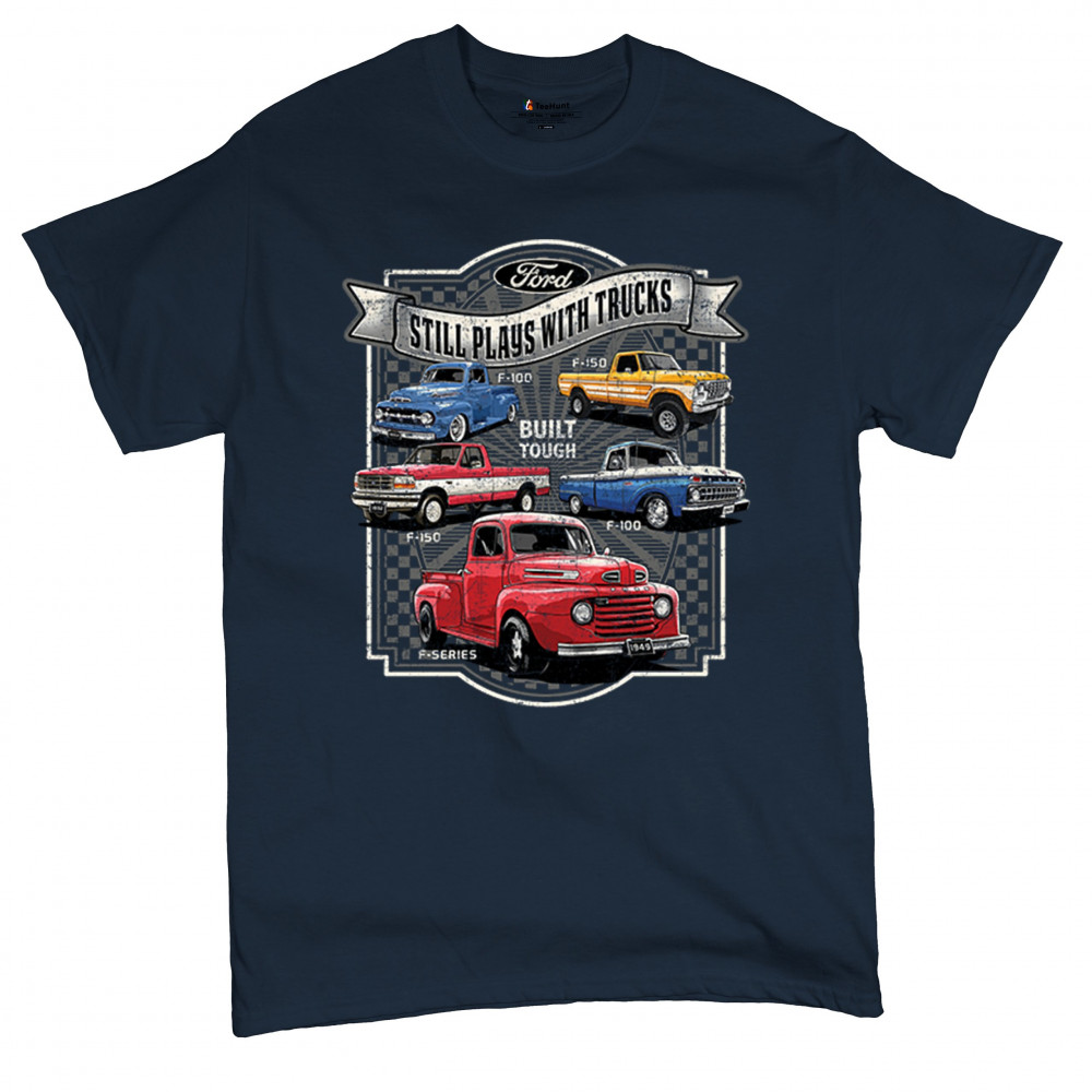 Features classic Ford F-Series trucks from 1949 to F-150. Great for vintage truck fans, garage wear, car shows, and collectors who love pickups.